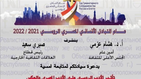 ضمن اجندة فعاليات عام التبادل الانسانى المصري الروسي2021 ـ 2022 التي أعدتها وزارة الثقافة ينظم قطاع العلاقات الثقافية الخارجية بالتعاون مع عدد من الجهات المصرية والروسية ندوة تتناول أثر الأدب الروسي على الأدب المصري والعكس وذلك فى السادسة مساء الثلاثاء 27 يوليو بالمجلس الأعلى للثقافة.