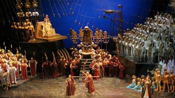 اشتركت فى الأداء فرقة عسكرية من الجيش المصري، احتشد على خشبة المسرح ثلاثمائة شخص فى مشهد مسيرة النصر، كان التشغيل الآلى عند تغيير بعض المَشاهد فى الفصل الرابع لايزال عسيرًا، مما أدى إلى أن يبدو السرداب مظلمًا تمامًا فى حين كان المَعبد فى أعلاه مباشرة مضيئًا لامعًا، ومع أن فيردى كان يساوره القلق مما سوف يكون لهذا الإطار الأثيرى ما أثر على موقف الغناء الثنائى الأخير فإن الأمر لم يكن يستدعى هذا القلق؛ لأن النتيجة لاقت كل القبول.