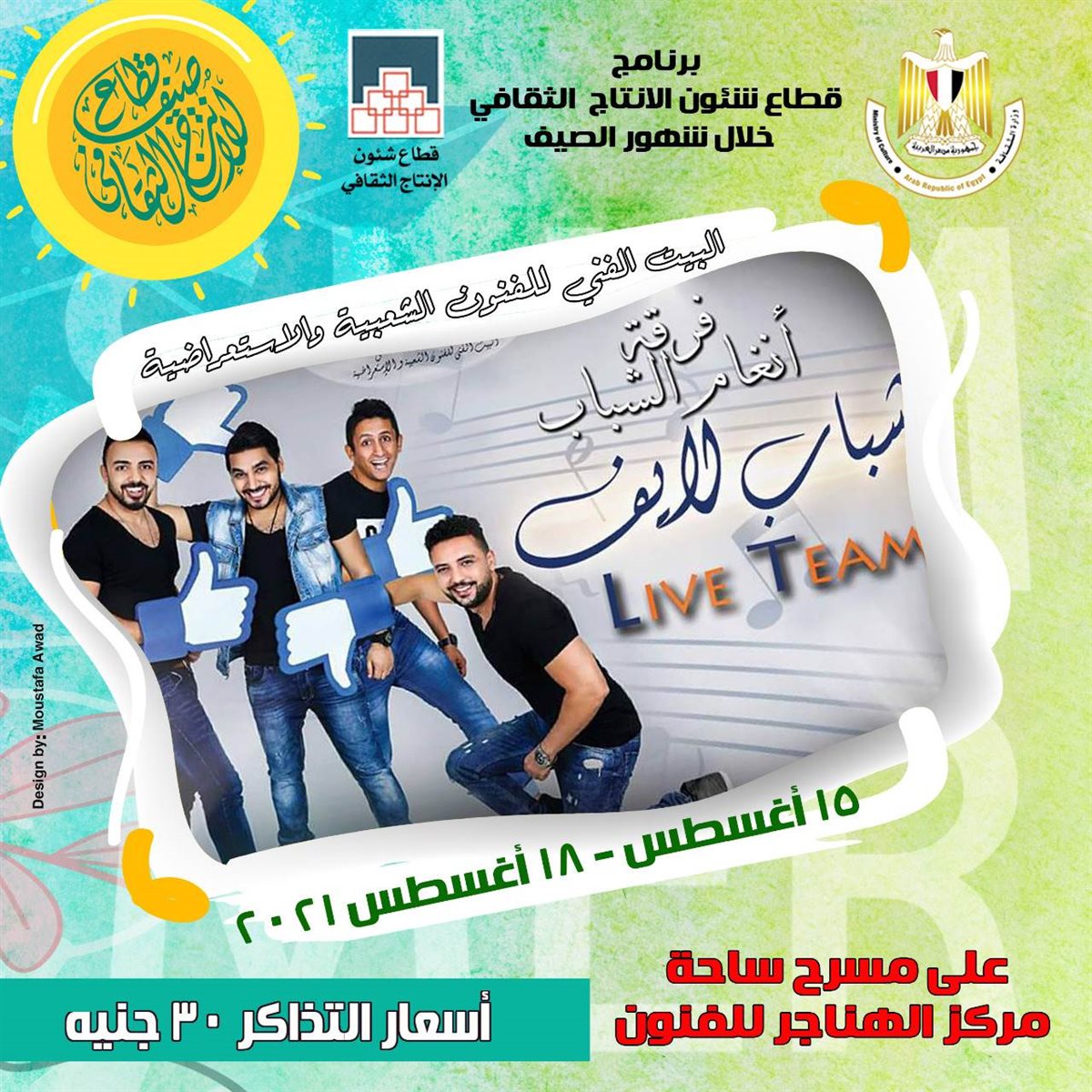 حيث يقدم فريق شباب لايف بفرقة أنغام الشباب بالبيت الفني للفنون الشعبية والاستعراضية، برئاسة المخرج عادل عبده، باقة متنوعة من أشهر الأغاني العاطفية والوطنية، يتغنى بها "عماد كمال، أحمد الأمير، عبدالله الجسمي، كمال كمال"، من خلال 4 حفلات في الفترة من 15 حتى 18 أغسطس الجاري، تحت إشراف الفنان ماهر عبيد مدير عام الفرقة.