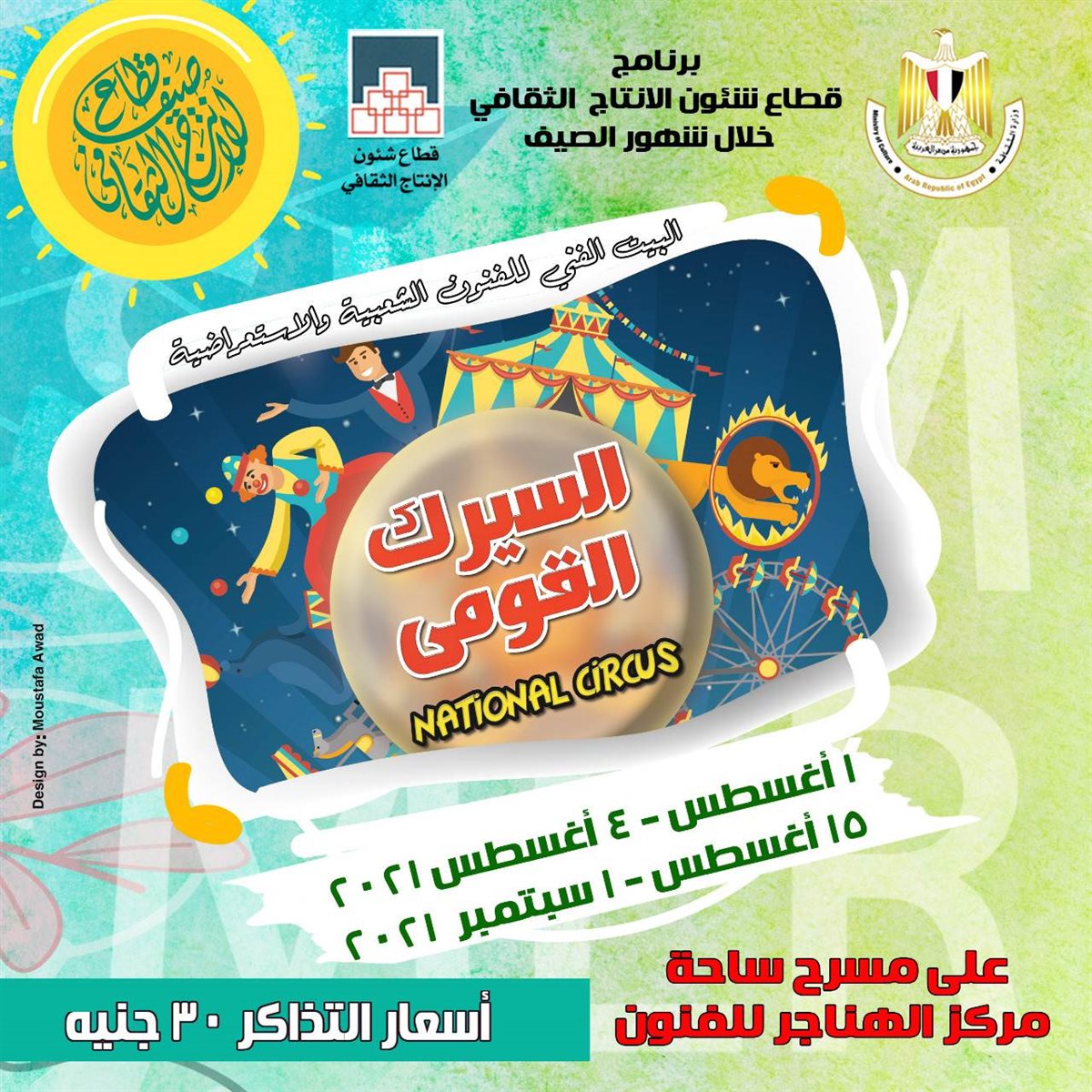 ويستأنف السيرك القومي بالبيت الفني للفنون الشعبية والاستعراضية، تحت إشراف الفنان وليد طه مدير عام السيرك، تقديم مجموعة من الفقرات الفنية منها "الساحر، المهرج، الكاوتشوك، التوازن، الجونجلير، البيسكليت، الدودة الشقية"، وغيرها من الفقرات الفنية التي تعشقها الأسرة المصرية، وذلك ضمن برنامج القطاع في الفترة من 15 أغسطس الجاري حتى 1 سبتمبر المقبل.