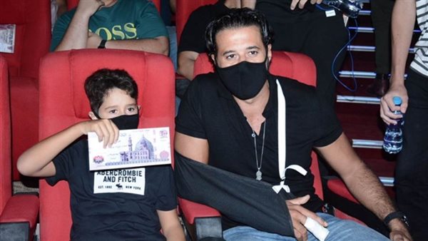 أحمد السعدني مع نجله في العرض الخاص لفيلم "200 جنيه" رغم الإصابة