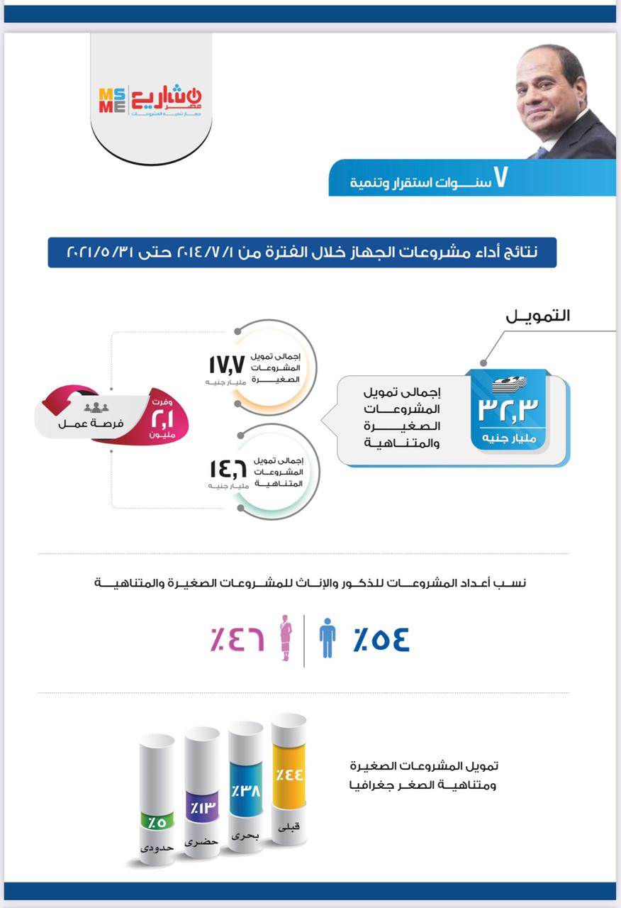 حقق الرئيس عبد الفتاح السيسي رئيس الجمهورية، العديد من الإنجازات الضخمة في مختلف المجالات، خصوصا في مجال تمكين المرأة، حيث بلغ حجم تمويل المشروعات الصغيرة ومتناهية الصغر للمرأة ٩٫٧ مليار جنيه، وبلغ عدد القروض٦٤٨٫٦١٠ وذلك للمشروعات الصغيرة ومتناهية الصغر، كما تم توفير ٣٠ ألف قرض للمشروعات الصغيرة، وتم تخصيص ٦١٨٫٤ ألف قرض للمشروعات المتناهية.