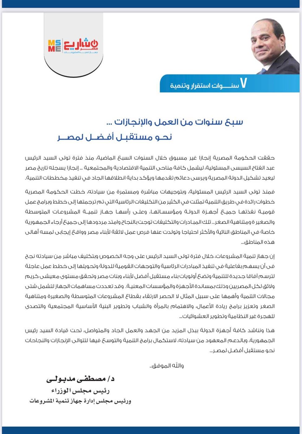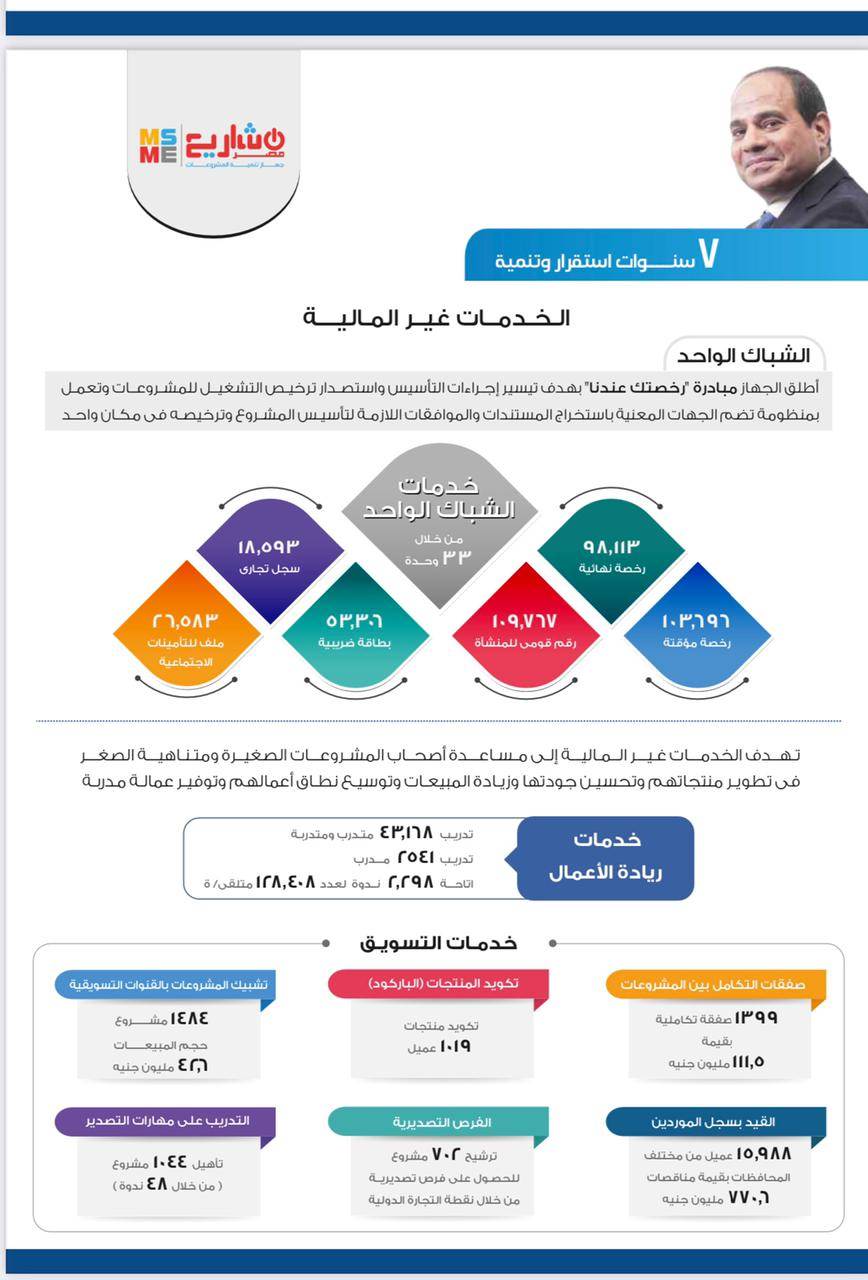 وقد تم توفير ٧٤١٫١٨٢ فرصة عمل بجميع محافظات الجمهورية، وقد بلغت نسبة الاستفادة من خدمات الشباك الواحد ٢٩٪، والتي منها خدمات استصدار التراخيص، السجل التجاري، البطاقة الضريبية، الرقم القومى للمنشأة، فتح ملفات التأمينات الاجتماعية.