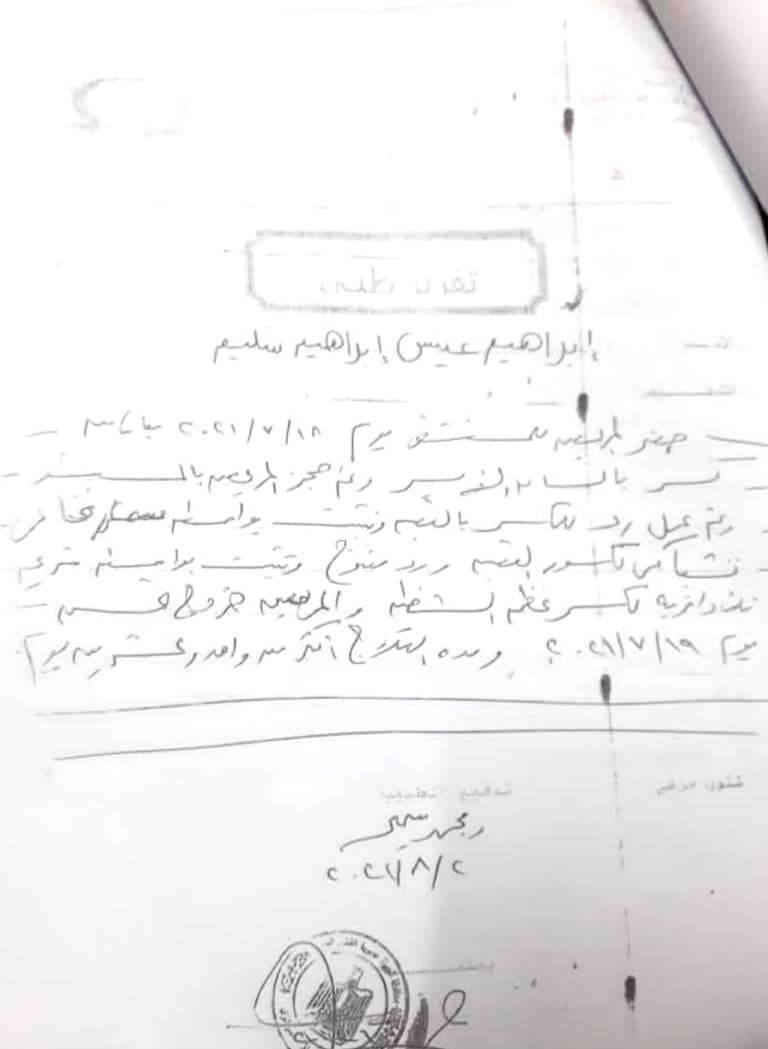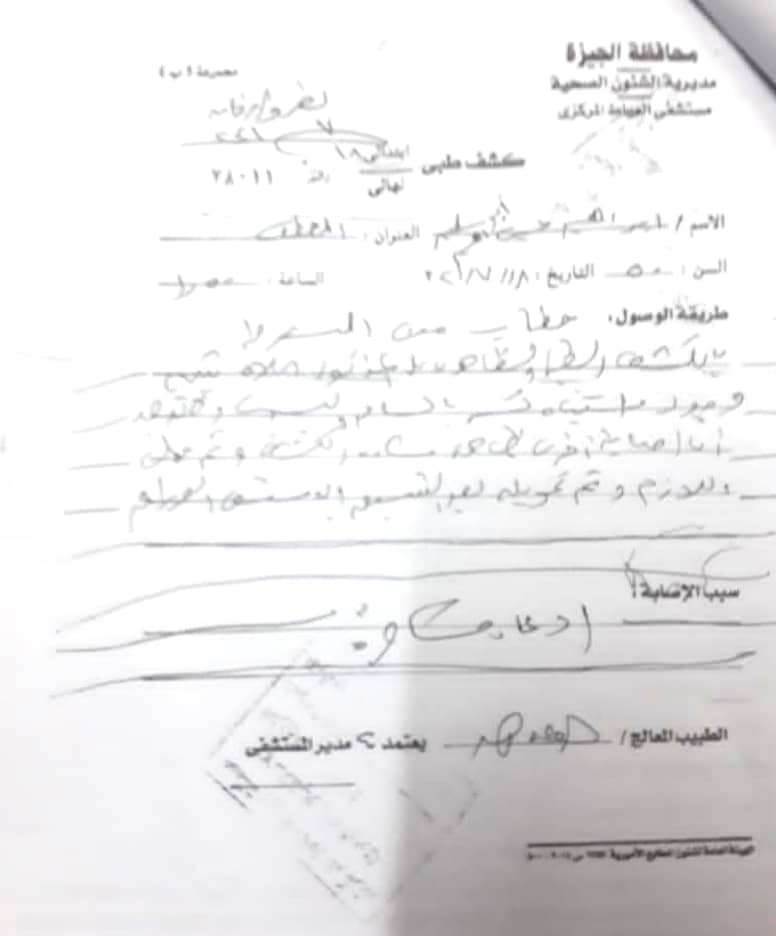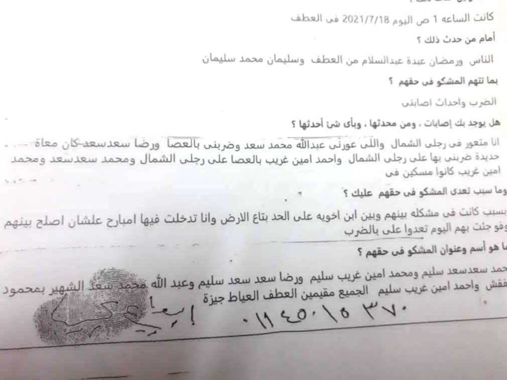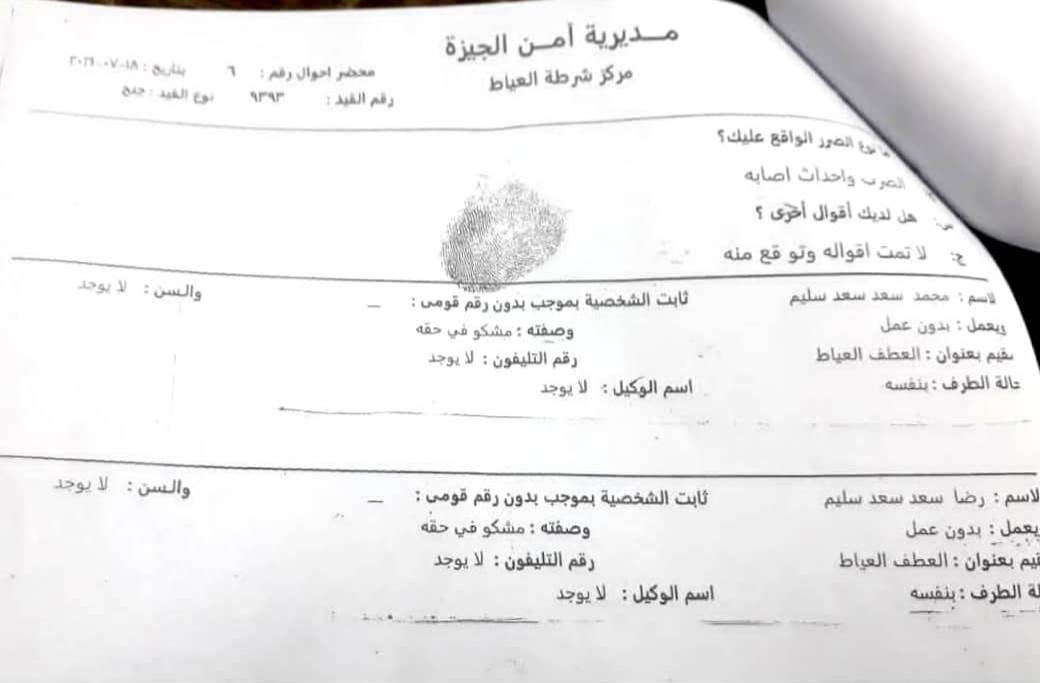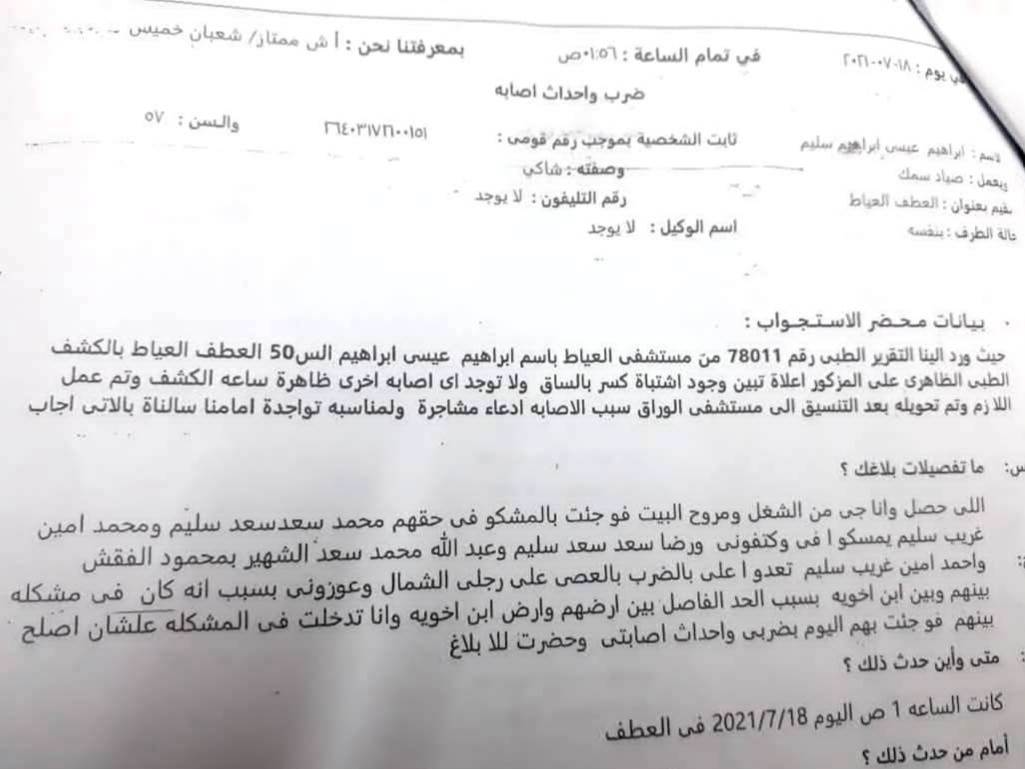 وجاء التقرير الطبي رقم 78011 من مستشفى العياط باسم إبراهيم عيسي إبراهيم السن 50 مقيم العطف العياط بوجود اشتباه كسر بالساق وجروح متفرقة بأنحاء الجسم وتم تحويله إلى مستشفى الوراق لتلقي العلاج اللازم، وتحرر المحضر رقم 9393 جنح العياط، وإحالته البلاغ إلى النيابة العامة لمباشرة التحقيقات.