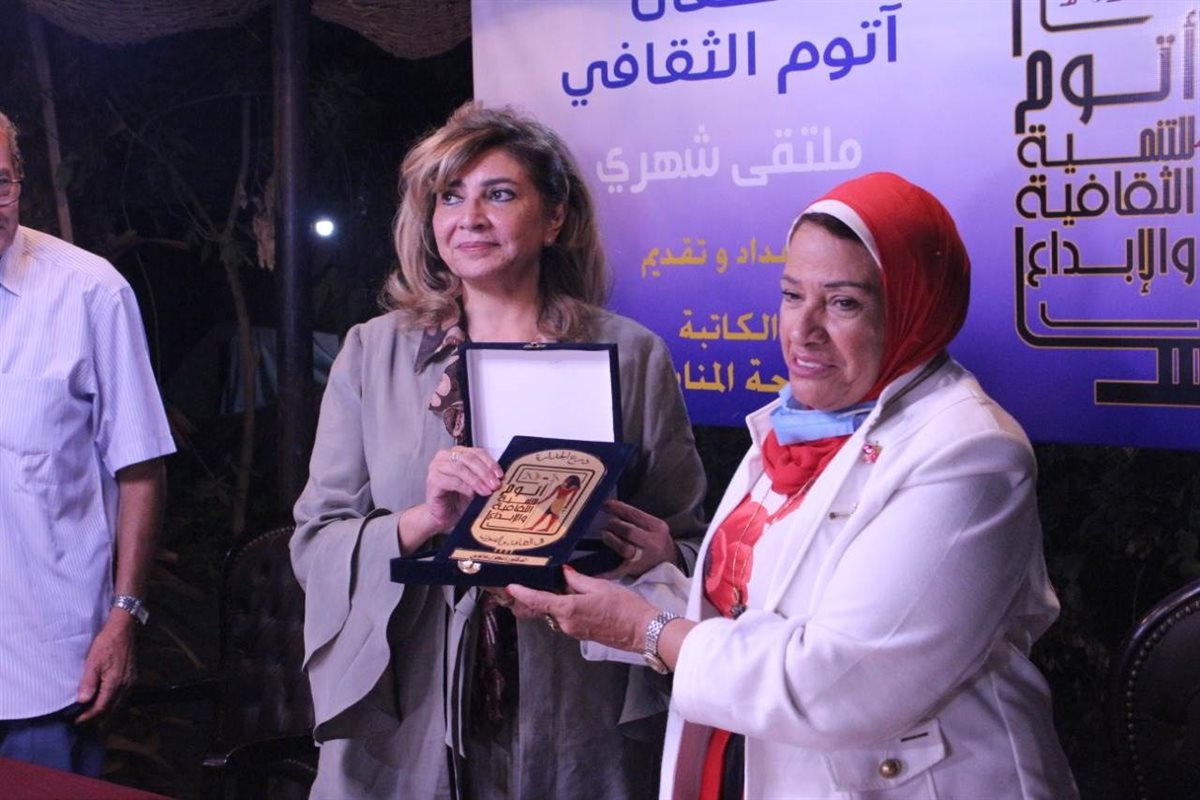 وفي ختام الملتقى، كرمت الكاتبة سميحة المناسترلي رئيس مجلس أمناء مؤسسة آتوم للتنمية الثقافية والإبداع، الكاتب الكبير ابو العلا السلاموني، والدكتورة نجوى عانوس، والكاتب أحمد عبد الرازق أبو العلا، وأهدتهم درع المؤسسة تقديرا لدورهم الفعال في المجالين الثقافي والفني.