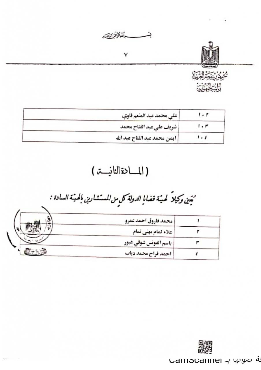 وتضمنت مادتة الثانية ترقية عدد 4 وكلاء هيئة قضايا الدولة، وتضمنت مادتة الثالثة تعيين عدد 98 مستشارًا من الفئة " أ ".
