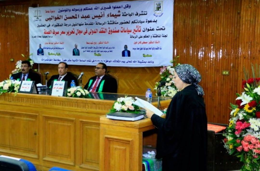 حصلت الباحثة شيماء أنيس الغوالبي على درجة الدكتوراه في القانون بتقدير جيد جداً من كلية الحقوق جامعة القاهرة، عن رسالتها التي حملت العنوان "تأثيرات سياسات صندوق النقد الدولي على تحرير سعر صرف العملة – دراسة تطبيقية للحالة المصرية".