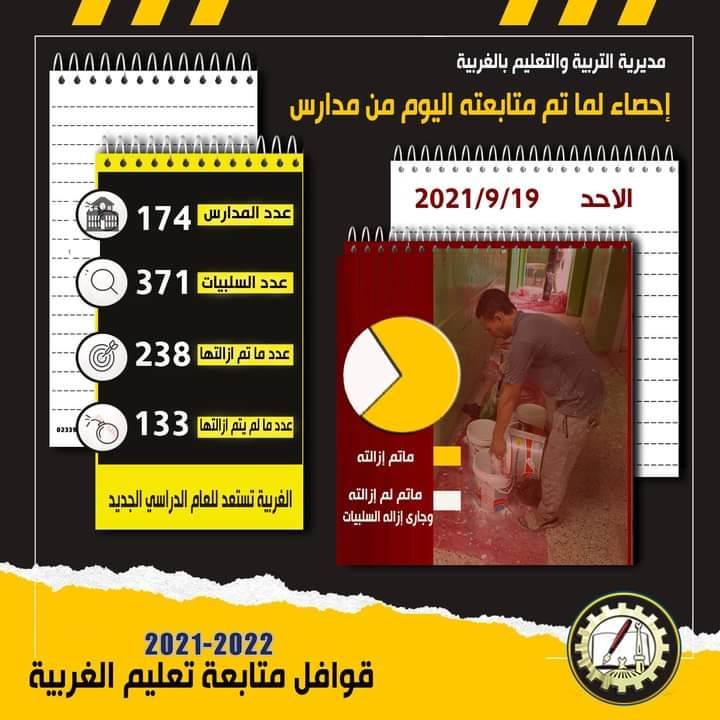 ويصل إجمالي المتابعات في اليوم السادس إلى 174 مدرسة، ووجود 371 سلبية تمت إزالة 238 سلبية منها، وجار العمل على إزالة 133 سلبية بالمدارس.
