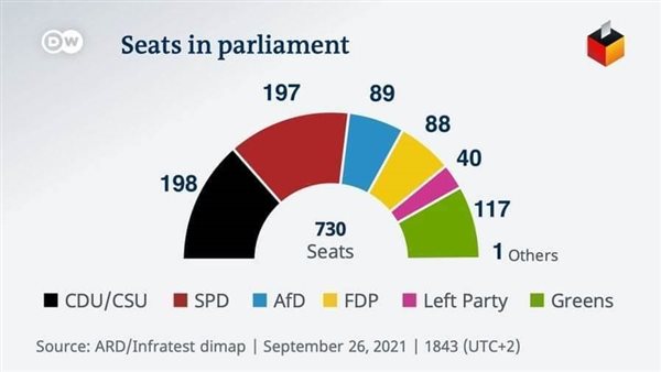 وأظهرت النتائج المتوقعة لـ ZDF أن البديل اليميني المتطرف لألمانيا "AfD" يسير على الطريق الصحيح للحصول على 10.5 في المئة، وهو أسوأ مما كان عليه قبل أربع سنوات عندما اقتحموا البرلمان الوطني بنسبة 12.6 في المئة من الأصوات، ومع استبعاد جميع التجمعات الرئيسية لائتلاف ونشر التلفزيون الألماني العام ZDF تقديرات جديدة في الساعة 9:48 مساءً بتوقيت برلين SPD: 26.0٪ CDU-CSU: 24.5٪ الخضر: 13.9٪ FDP: 11.7٪ AfD: 10.5٪ يموت لينك: 5٪