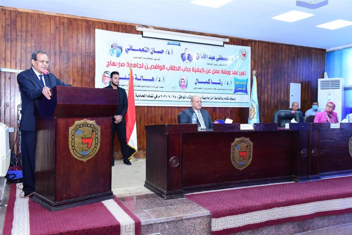 وخلال كلمته أكد الدكتور مصطفى عبدالخالق، أن الجامعة تسعى لتطوير منظومة الطلاب الوافدين وتقديم خدمات مميزة لهم، وذلك ضمن إجراءات مبادرة (ادرس في مصر)، باعتبارها مشروع قومي تتكاتف فيه كل أجهزة الدولة لتذليل الصعوبات وتيسير الإجراءات اللازمة للتقدم للدراسة في مصر، مضيفاً أن ورشة العمل ناقشت آليات جذب الطلاب الوافدين من الدول المختلفة للدراسة بالجامعة، وتقديم خدمات تعليمية مميزة لجذب أكبر عدد من الطلاب، موجهاً شكره للدكتورة رشا كمال والدكتورة هالة مقلد ممثلين عن الإدارة المركزية لشؤون الطلاب الوافدين بوزارة التعليم العالي، لحضورهم تلك الورشة.