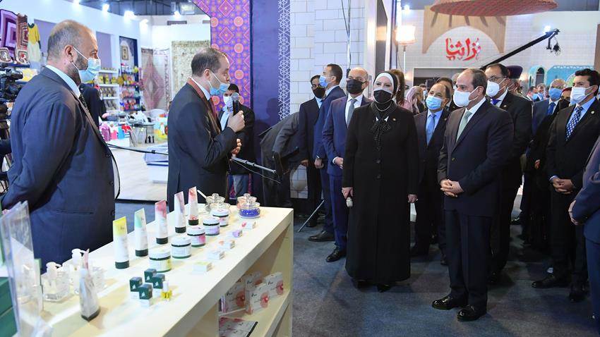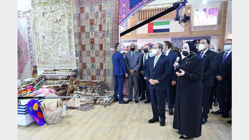 وتفقد الرئيس السيسي ،المنتجات المعروضة، كما تبادل الحديث مع العارضين من الشباب والسيدات وذوي الاحتياجات الخاصة ، واستمع إلى المشكلات التي تواجههم وما يمكن تقديمه لهم لتذليل هذه العقبات وتطوير وتوسيع أعمالهم لتحقيق المزيد من النفاذ للأسواق المحلية والخارجية . وقالت نيفين جامع وزيرة التجارة والصناعة إنه يشارك في المعرض هذا العام 1500 عارض محلي بالإضافة إلى أجنحة للمنتجات التراثية واليدوية من دول الإمارات والأردن والسودان وذلك في إطار تعزيز التعاون والروابط المشتركة بين الشعوب وتشجيع التجارة البينية والتكامل الاقتصادي إقليميًا.