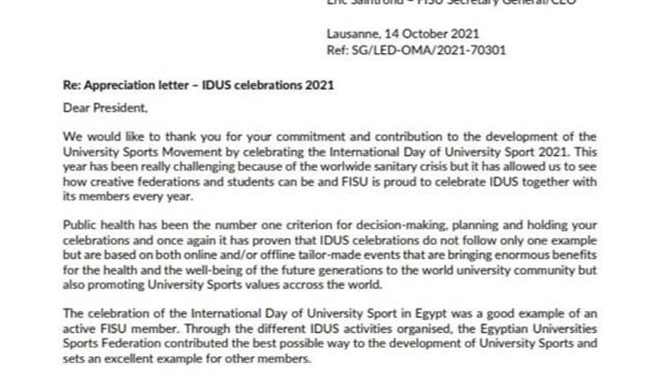 تسلم الاتحاد الرياضي المصري للجامعات، رسالة من نظيره الدولي، تضمنت خطاب شكر من أوليج ماتيتسين، رئيس الاتحاد الدولي للرياضة الجامعية وموقع من ليونز إيدر نائب رئيس الاتحاد الدولي للرياضة الجامعية وإيريك سانتروند السكرتير العام موجه إلي الدكتور خالد عبد الغفار، رئيس الاتحاد الرياضي المصري للجامعات، بشأن نشاط الاتحاد المصري خلال اليوم العالمي للرياضه الجامعية، إلى جانب تقديم الشكر لكل فريق العمل بالاتحاد الرياضي المصري للجامعات.