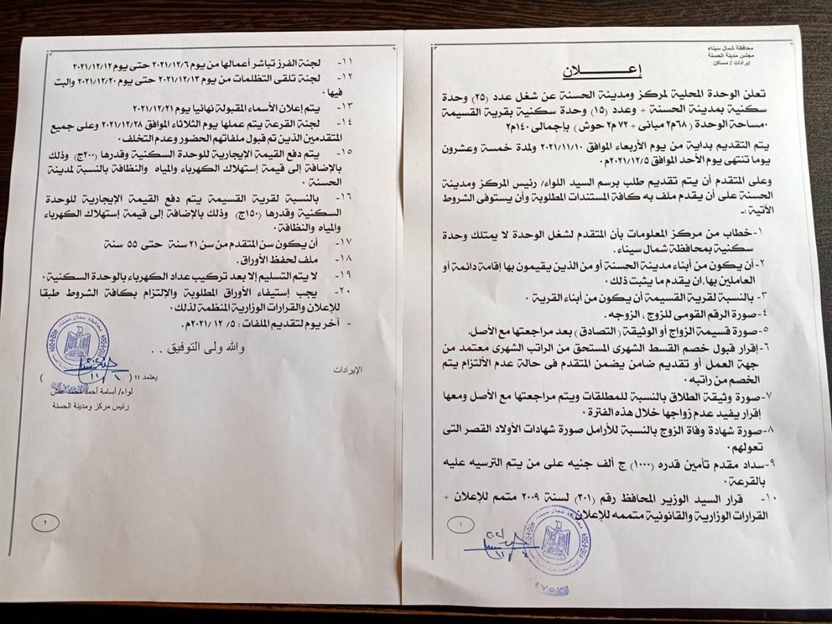 مجلس مدينة الحسنة بوسط سيناء يعلن طرح 40 وحدة سكنية على المواطنين