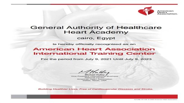 وأكد رئيس الهيئة، أن حصول المراكز التدريبية للهيئة على اعتماد جمعية القلب الأمريكية، هي شهادة تميز ونجاح ومن أعلى المراتب التي يمكن أن يُحصل عليها من الجمعية التي تعد ضمن البرامج المعترف بها عالميًا في إنقاذ وعلاج مرضى القلب، ومؤكدًا جهد هيئة الرعاية الصحية المستمر وسعيها نحو تحقيق أعلى معايير الجودة في كافة خدماتها الصحية، والتي مكَّنتها من الوصول لهذا الإنجاز وإنجازات أخرى متتالية تعمل عليها الهيئة، تتوازى مع التطلعات والطموحات التي تستهدف تقديم خدمة صحية مميزة ذات جودة عالمية للمصريين.