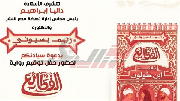 تقيم دار نهضة مصر للنشر بقيادة داليا إبراهيم رئيس مجلس إدارة الدار، حفل توقيع ومناقشة للدكتورة ريم بسيونى لرواية "القطائع...ثلاثية ابن طولون" وذلك غدًا الثلاثاء 9 نوفمبر فى تمام الساعة 6:30 مساء.