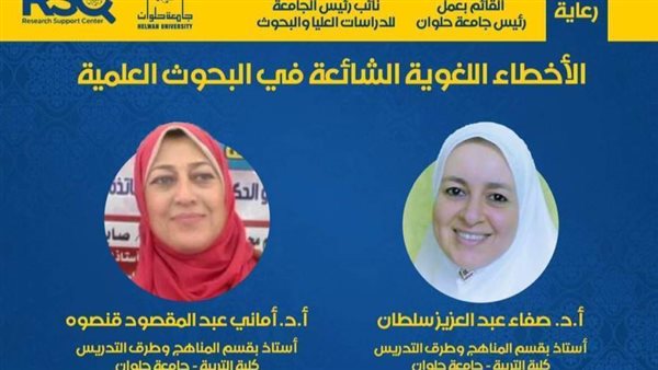 انطلاقا من دور جامعة حلوان كمؤسسة تعليمية وبحثية تهتم بالنهوض بالبحث العلمي ومخرجاتة، نظم مركز دعم البحث العلمي، ورشة عمل بعنوان الأخطاء اللغوية الشائعة في البحوث العلمية وذلك عبر برنامج zoom، تحت رعاية الدكتور ممدوح مهدي، القائم بعمل رئيس الجامعة، والدكتورة منى فؤاد عطية، نائب رئيس الجامعة للدراسات العليا والبحوث، وإشراف الدكتور محمد القصاص، مدير مركز دعم البحث العلمي ومستشار قطاع الدراسات العليا للبحث العلمي.
