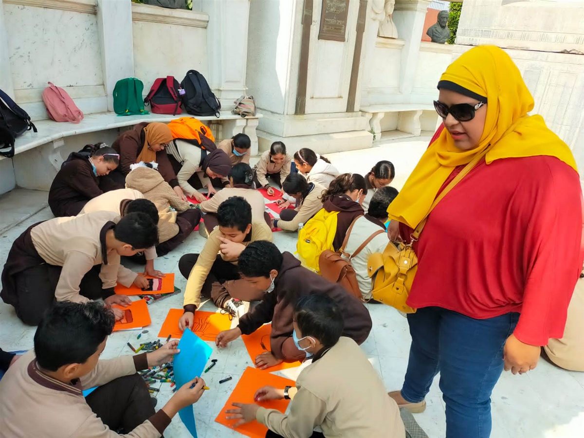 أعقب الزيارة ورشة فنون تشكيلية للرسم الحر تعكس انطباع التلاميذ عن الزيارة وما تأثروا به والتعبير عنه بالوان الفلوماستر على أوراق كانسون ملون تحت إشراف الفنانة غادة عبد النبي.