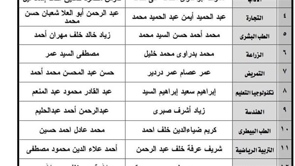 من جانبه، قال الدكتور عبدالناصر يس نائب رئيس الجامعة لشؤون التعليم والطلاب، إن الطالب محمود السيد خضيري بكلية التربية فاز بمنصب رئيس الاتحاد، ومصطفى علي موسى بمنصب نائب رئيس الاتحاد، وفى كلية العلوم فاز أحمد محمد ثابت رئيسًا للاتحاد، ونائبه محمود ذكي علام، وبكلية الآداب فاز أشرف أبو قاوي محمد، رئيسًا للاتحاد، ونائبه فارس محمود صديق، وبكلية التجارة فاز عبدالحميد أيمن عبدالحميد، برئاسة الاتحاد، ونائبه عبدالرحمن أبو العلا شعبان، وبكلية الطب البشري تم انتخاب محمد أحمد حسن رئيسًا للاتحاد، ونائبه زياد خالد خلف مهران، وفى كلية الزراعة فاز محمد بدراوي محمد، رئيسًا للاتحاد، ونائبه مصطفى السيد عمر، أما كلية التمريض حصد عمر عصام دردير رئاسة الاتحاد، فيما حصد حسن عبدالمحسن محمد منصب النائب.