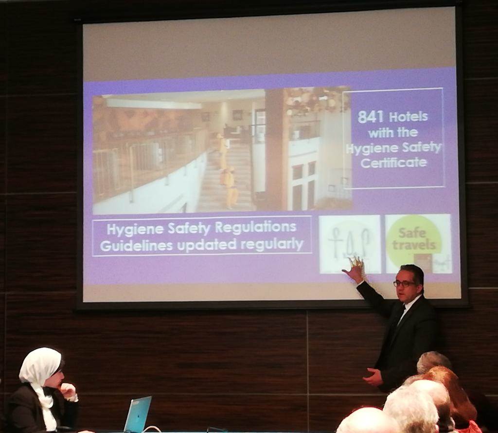 كما تحدث الوزير خلال اللقاء عن أهم الإجراءات الاحترازية وضوابط السلامة الصحية التي تتخذها الدولة المصرية للحفاظ على صحة وسلامة المواطنين والسائحين والعاملين بالقطاع، لافتا إلى ان هذه الإجراءات تم وضعها وفقًا لمعايير منظمة الصحة العالمية لمواجهة تداعيات فيروس كورونا، هذا بالإضافة إلى قيام مصر بتطعيم جميع العاملين في القطاع السياحي بالمحافظات السياحية ومعظم المواطنين بها بالأمصال المضادة لفيروس كورونا، وجارٍ تطعيم باقي المحافظات.