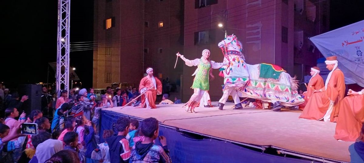 قدمت فرق "الشرقية، الأقصر، توشكى" للفنون الشعبية، عدد من الفقرات الفنية والاستعراضية التي تعبر عن التراث الفلاحى والصعيدى والنوبى بحى السلام بوادى العلاقى.