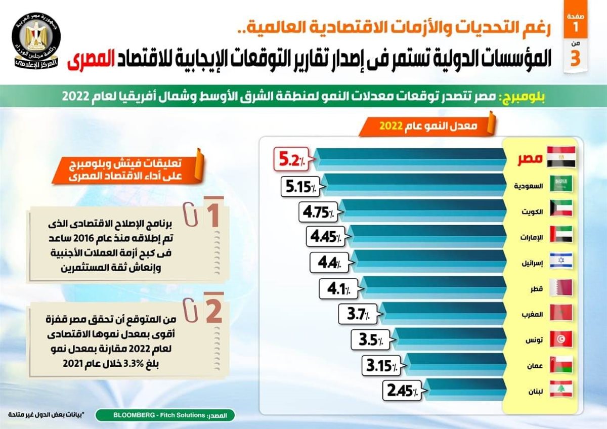 وكشف التقرير عن توقعات (بلومبرج) بتصدر مصر معدلات النمو لمنطقة الشرق الأوسط وشمال إفريقيا عام 2022، وذلك بمعدل 5.2%، فيما توقعت أن تحقق مصر قفزة أقوى بمعدل نموها الاقتصادي لعام 2022 مقارنة بمعدل نمو بلغ 3,3% خلال عام 2021.