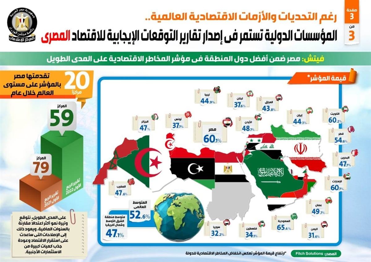 ووفقًا لفيتش أيضًا فإن مصر تأتي ضمن أفضل دول المنطقة في مؤشر المخاطر الاقتصادية على المدى الطويل، حيث حصلت على 60.1 نقطة، فيما تقدمت مصر 20 مركزًا بالمؤشر على مستوى العالم خلال عام، حيث جاءت في المركز 79 في تقرير الربع الأول 2021، بينما جاءت في المركز 59 في تقرير الربع الأول 2022.