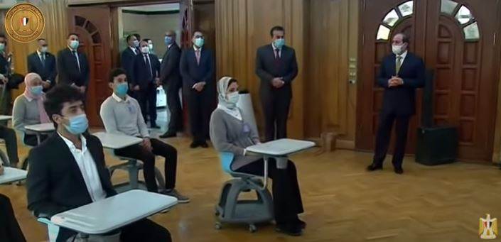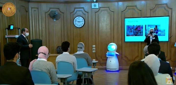 وقد حضر الرئيس السيسي مع الطلاب محاضرة عن الذكاء الاصطناعي في مجال الزراعة، بإحدى قاعات التدريس بالجامعة.