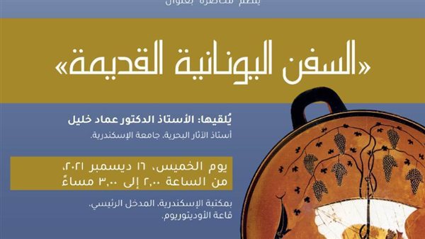 تنظم مكتبة الإسكندرية في إطار الاحتفال بيوم المتوسط، بالتعاون مع مركز العلوم ومتحف التكنولوجيا في سالونيك (NOESIS)، وبرعاية الأمانة العامة لليونانيين في الخارج بوزارة الشؤون الخارجية بجمهورية اليونان، محاضرة بعنوان "السفن اليونانية القديمة "، يلقيها الاستاذ الدكتور عماد خليل؛ استاذ كرسي اليونسكو للآثار البحرية، جامعة الإسكندرية، وذلك الساعة الثانية مساء يوم الخميس الموافق 16 ديسمبر 2021، بقاعة الأوديتوريوم بالمدخل الرئيسي بمكتبة الإسكندرية.