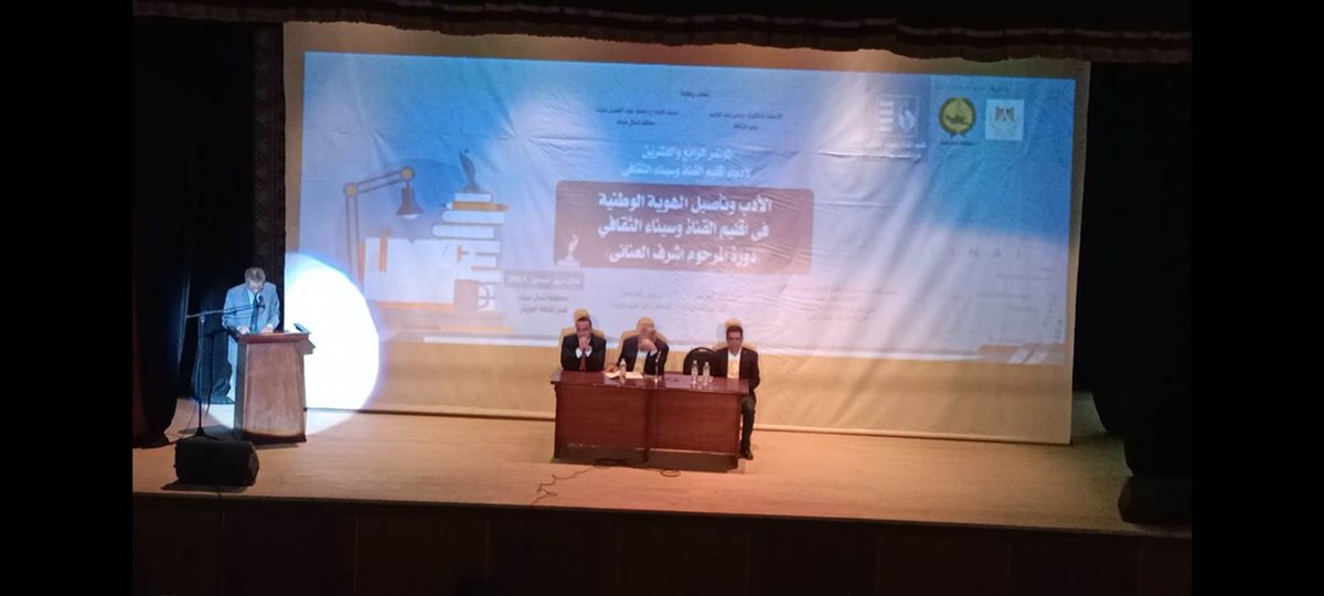 وأضاف أن عنوان المؤتمر اشارة واضحة للهوية الوطنية وتأكيد الانتماء لأرض الوطن، ويحاول الأدباء والمفكرون والشعراء وكل رموز الثقافة المساهمة في اعادة الحياة الى جزء عزيز من أرض الوطن الذي تعمل قواته المسلحة مع الشرطة وأهالى سيناء على القضاء على الارهاب الدخيل على سيناء .. مشيراً الى أن دور الأدب والثقافة هام وكبير في تأصيل الهوية الوطنية وتعميق معانى الولاء والانتماء للوطن ويحافظ على ثبات المجتمع ، والأدباء هم القوى الناعمة التي تتصدى لكل ما يمس الوطن، وهم الذين يستشعرون بقضاياه، وأن الكثير من التحديات التي تفرض نفسها على المجتمع هى التمسك بهويتنا وحضارتنا والانفتاح دون أن نفقد شيئا من هويتنا .