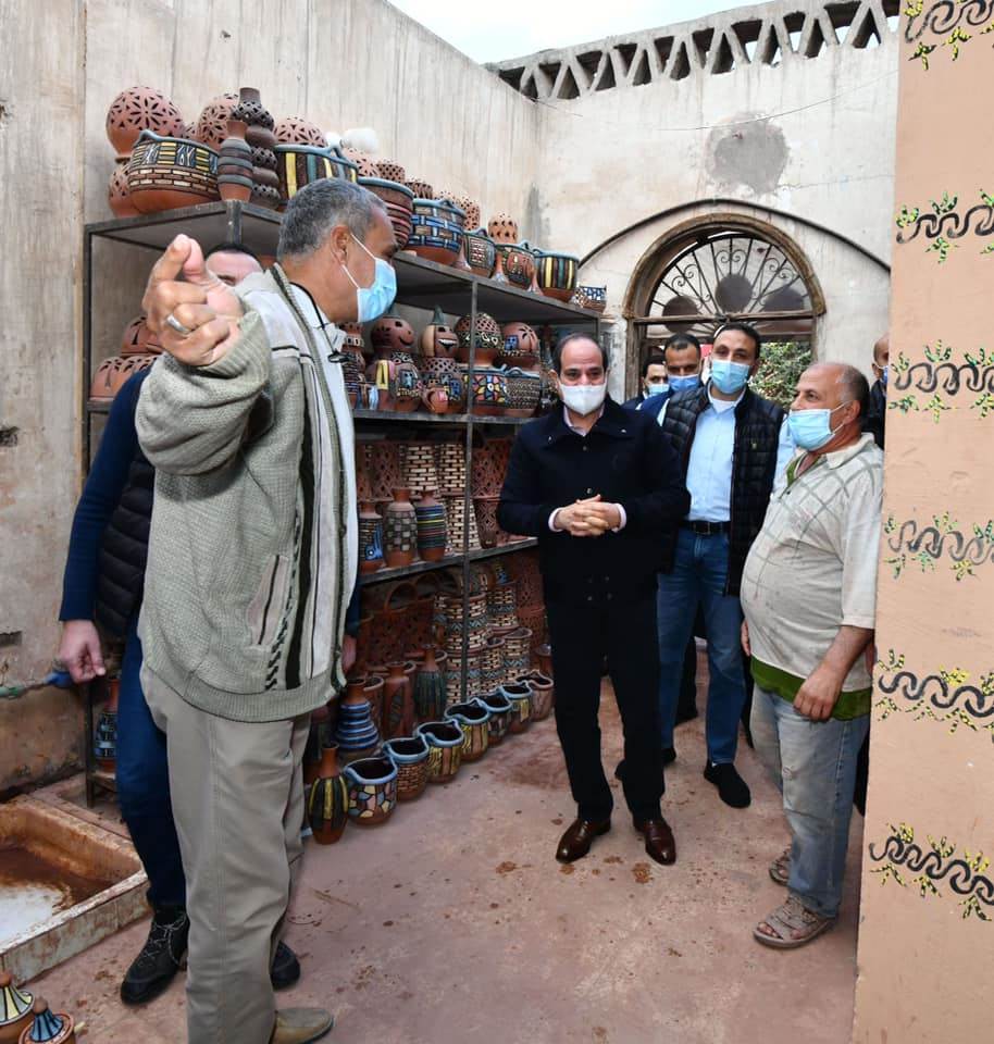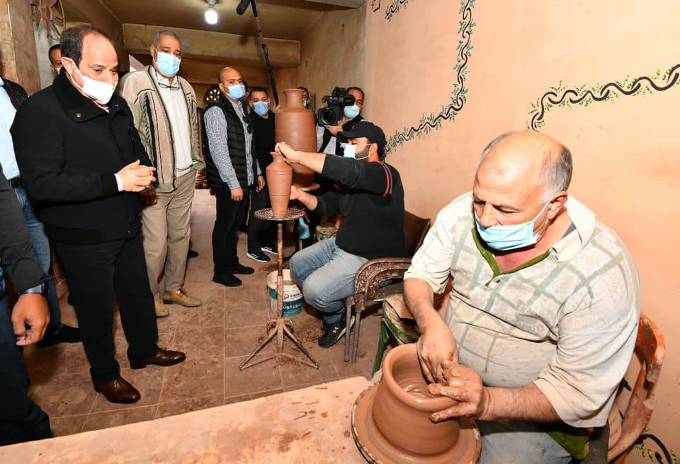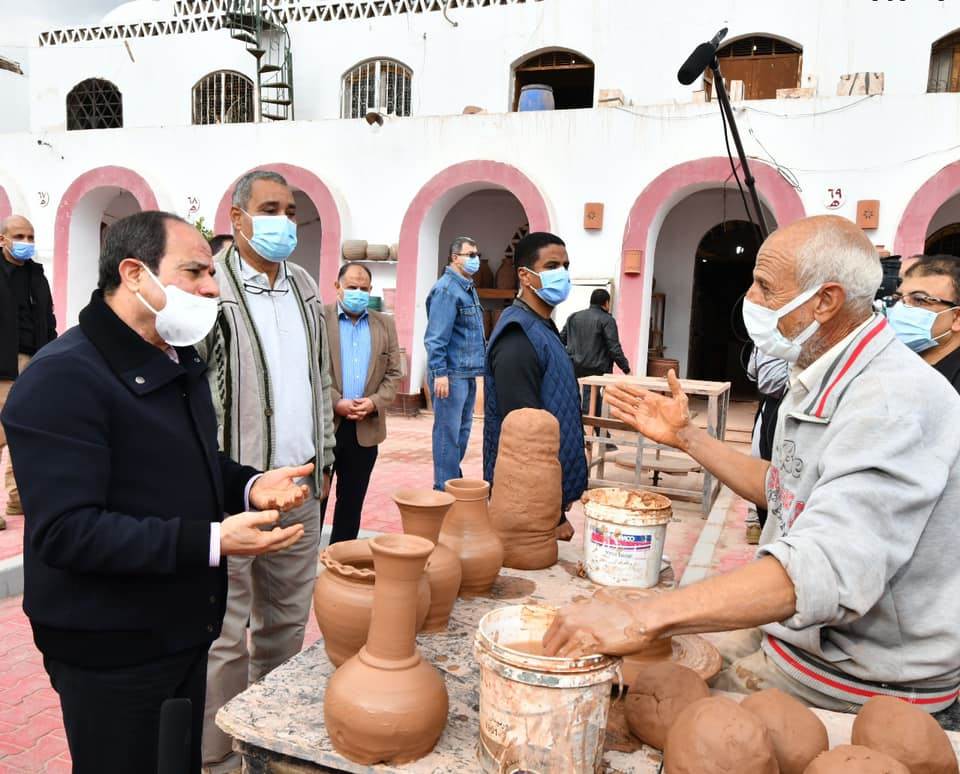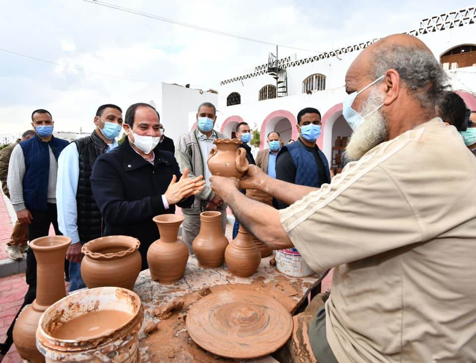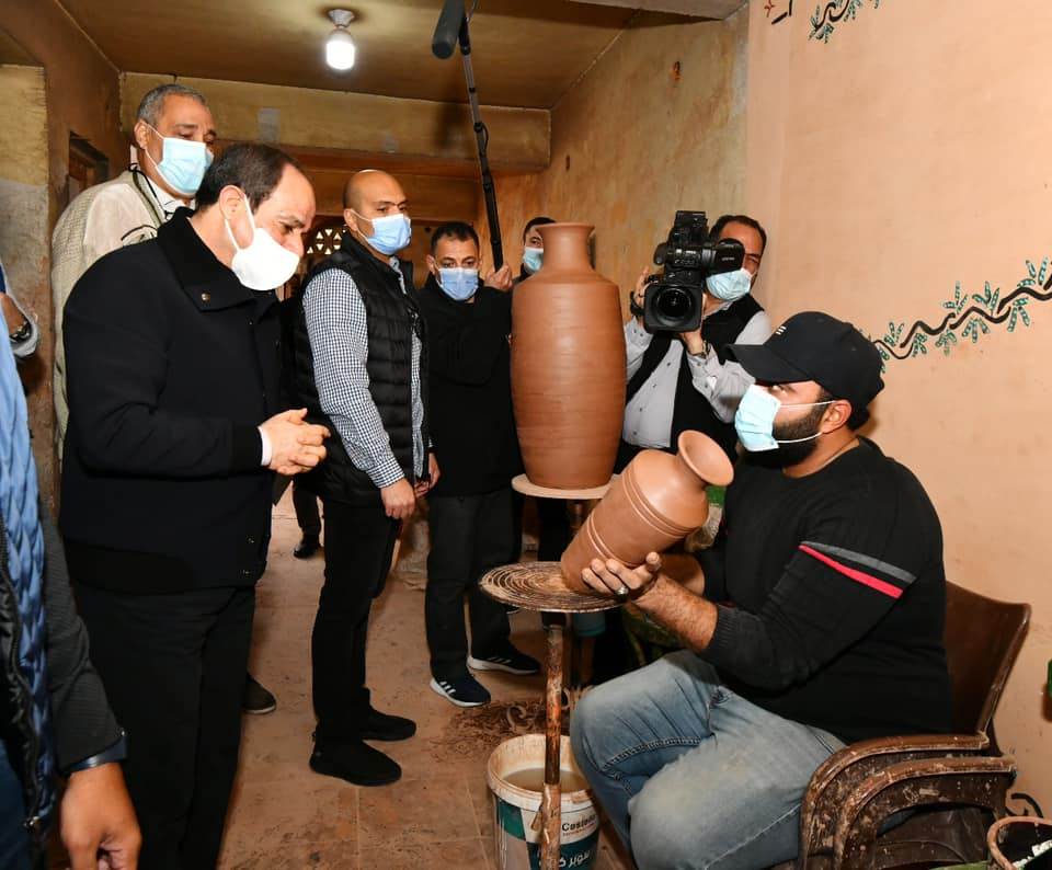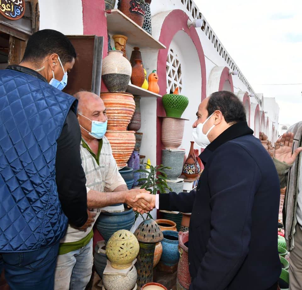 الرئيس السيسي يتوقف لتبادل التحية مع العاملين في ورش الفخار بمصر القديمة