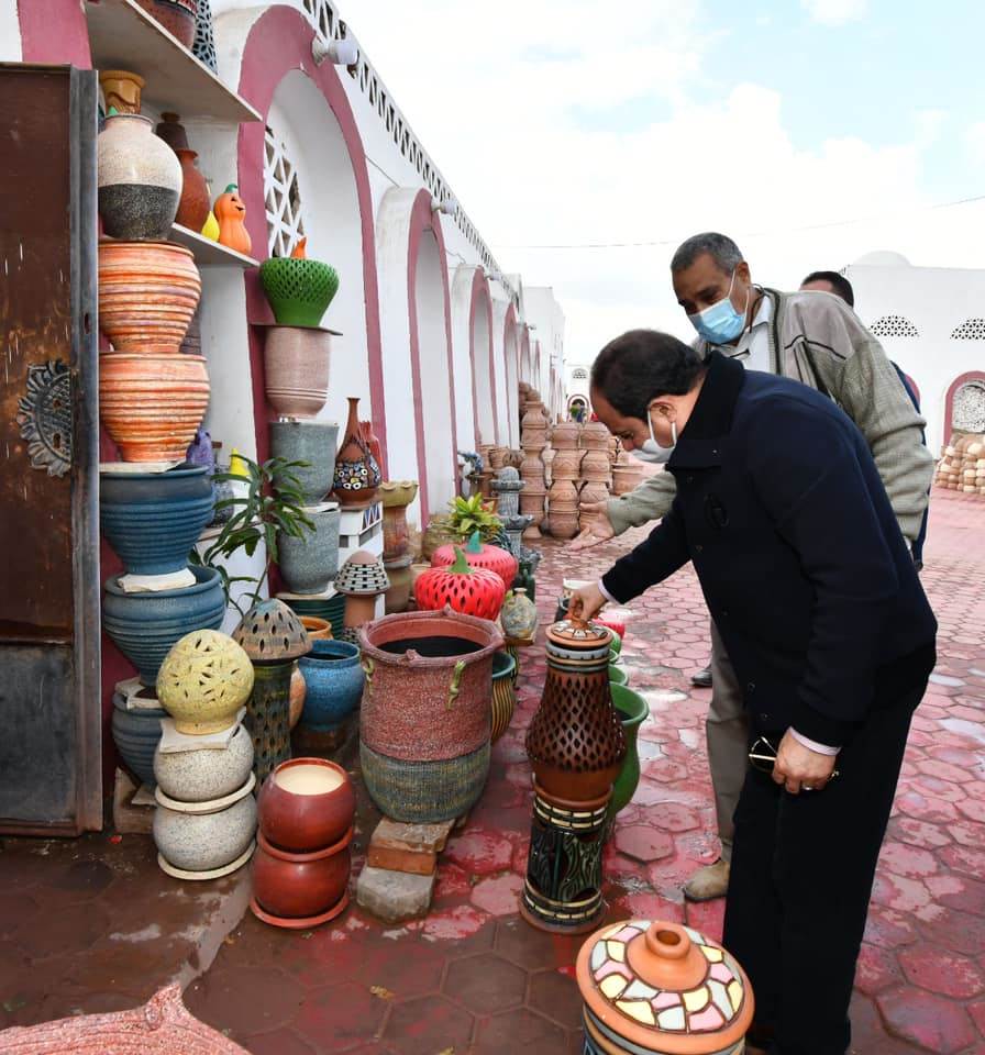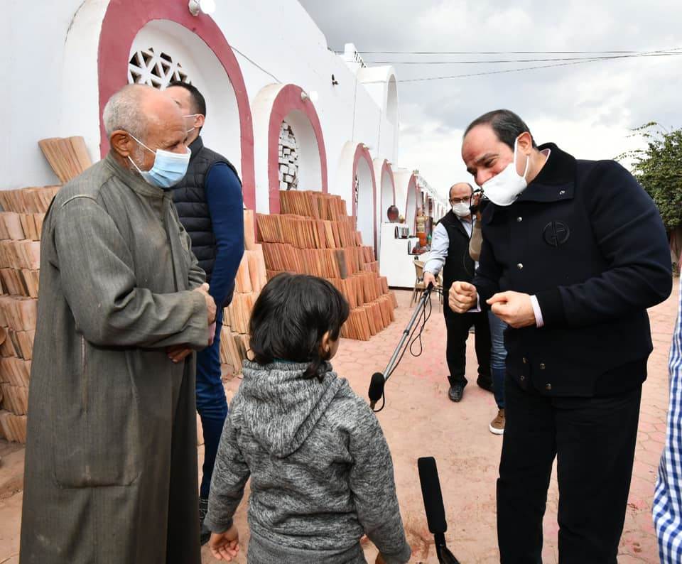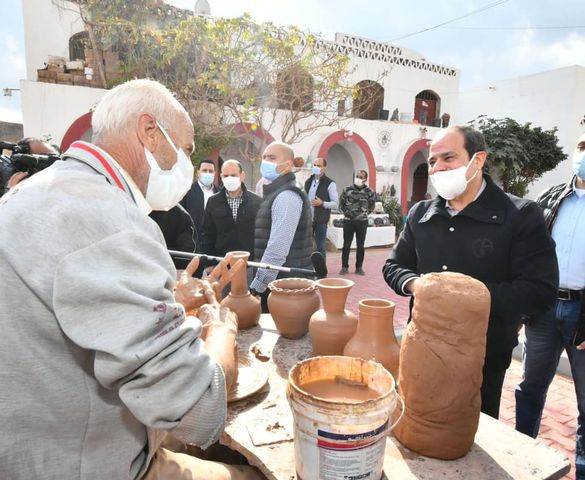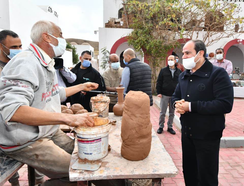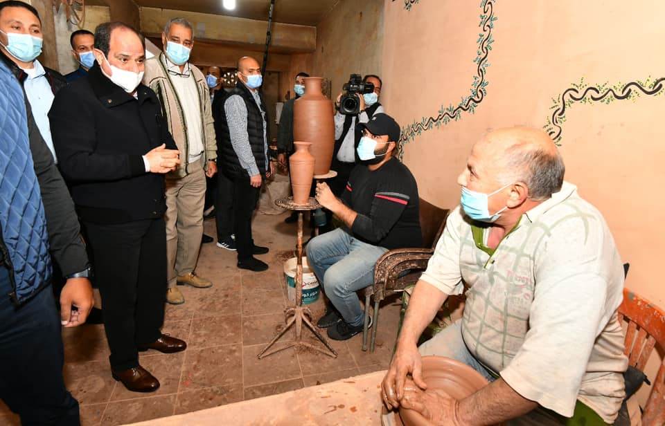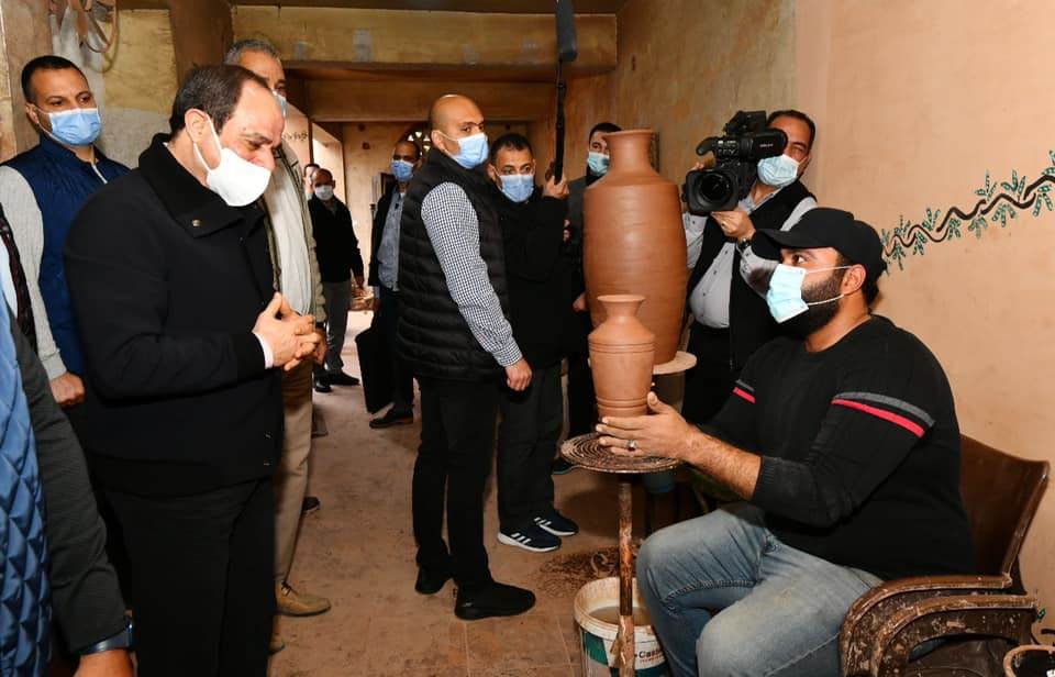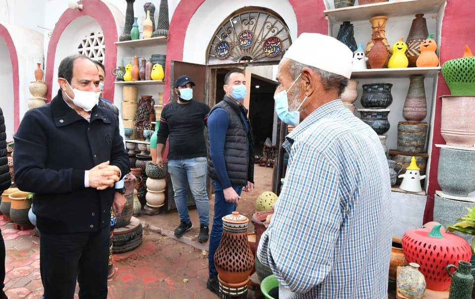 الرئيس السيسي يتوقف لتبادل التحية مع العاملين في ورش الفخار بمصر القديمة