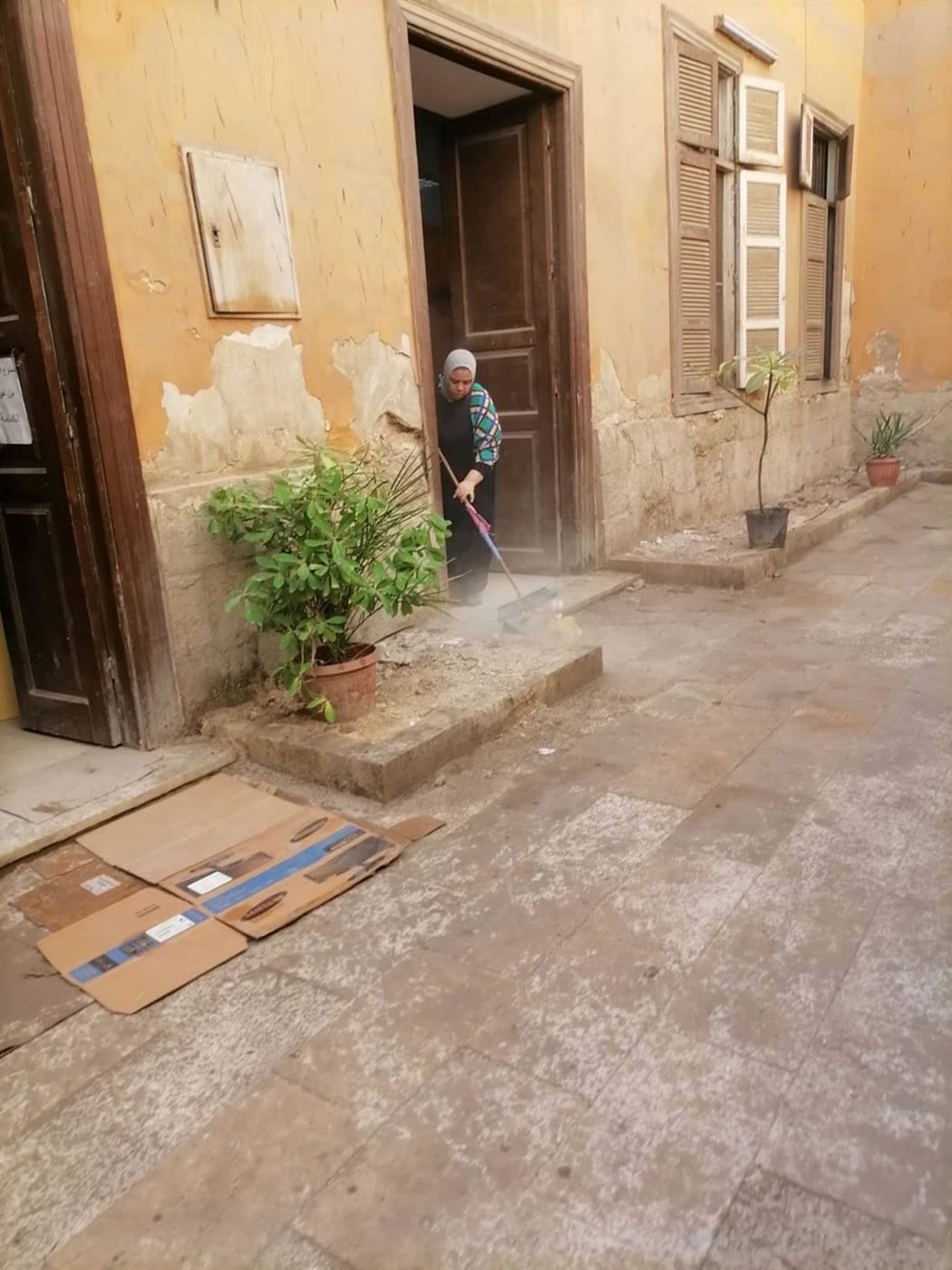 فقد واصلت أعمالها، اليوم، بالتعاون والتنسيق مع السيد المشرف على الخدمات المعاونة برش وتطهير مبنى قصر إسماعيل باشا المفتش على النحو التالي: