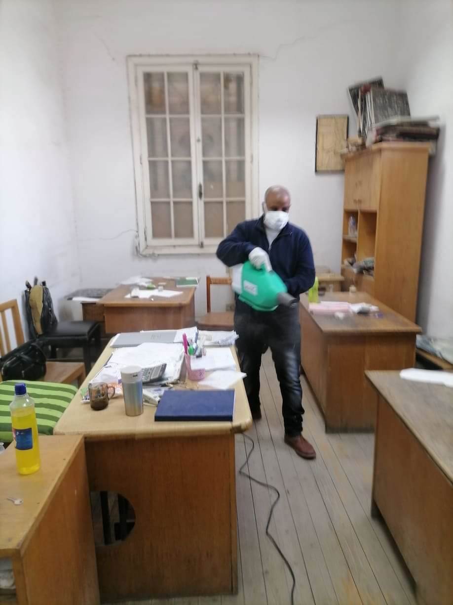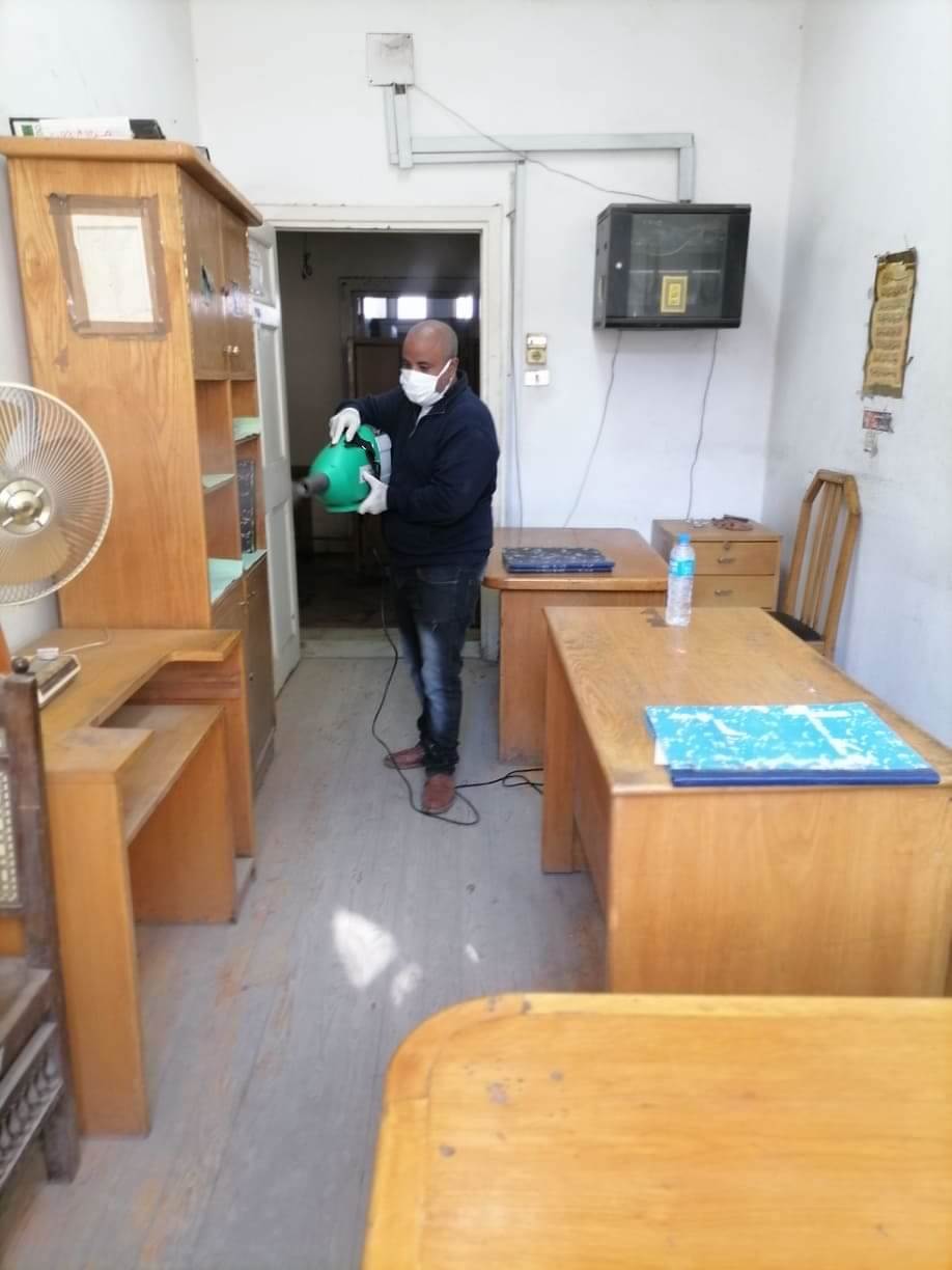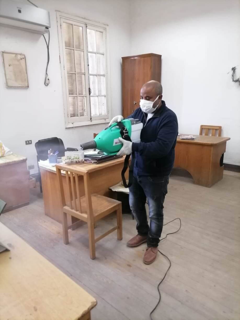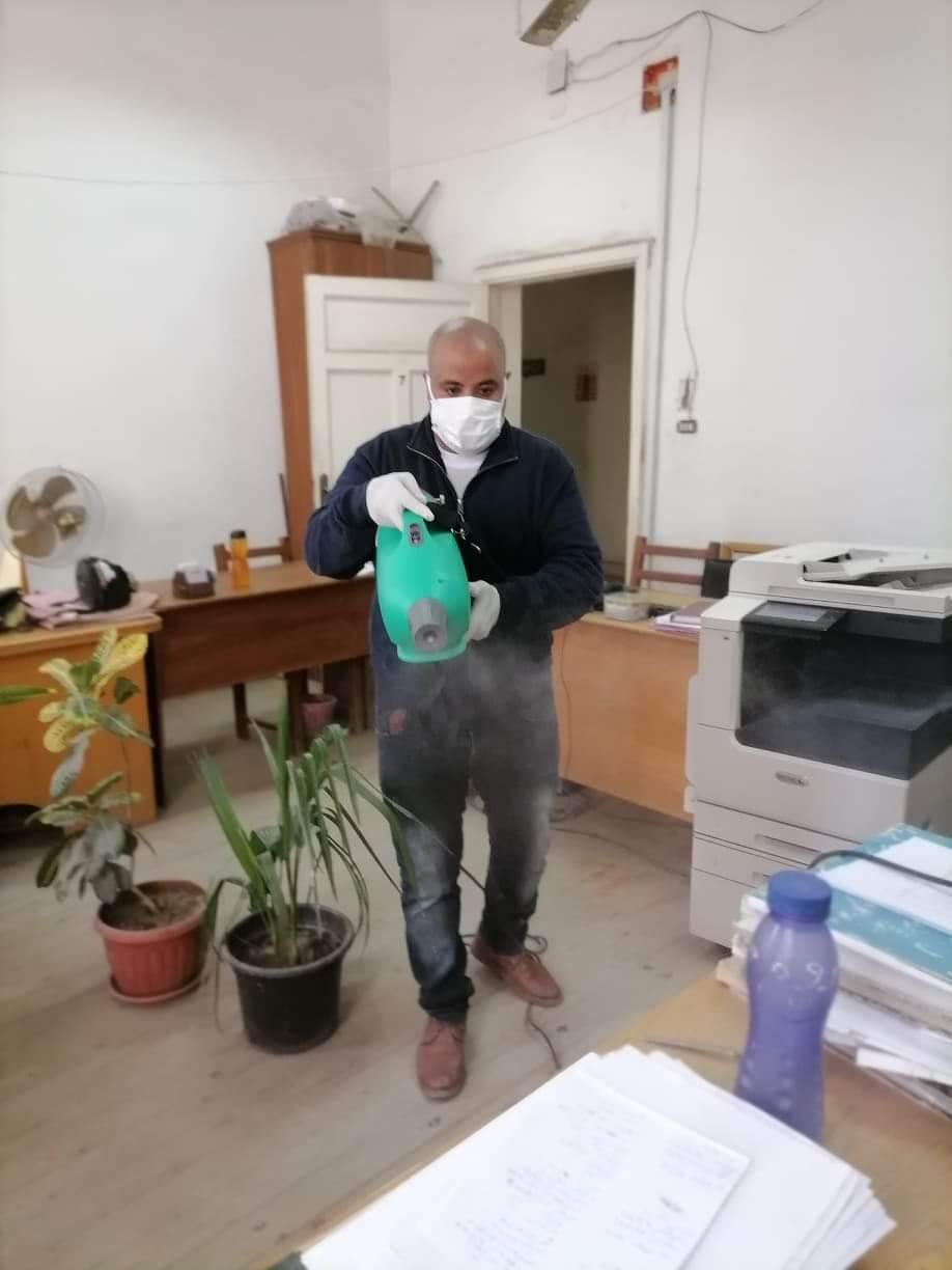 في ظل الإجراءات والتدابير الاحترازية والوقائية التي تتخذها الدولة بهذا الشأن تضمنت قائمة أعمالها رش وتطهير كافة المكاتب ورش الطرقات بمعطر جو برائحة الخوخ عقب تنظيفها ورشها بالماء لبعث الراحة والطمأنينة داخل نفوس العاملين شملت أعمال الرش والتطهير جميع الأسطح والمداخل والمخارج لجميع الأماكن الحيوية بكامل أرجاء القصر والأبواب والمسطحات والحمامات وغيرها من أماكن الملامسة للإنسان أعمال الرش والتطهير تمت وفقا للمعايير الدولية باستخدام مواد معتمدة من وزارة الصحة المصرية حفظ الله مصر أرضا وجيشا وشعبا.