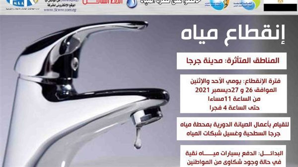 أعلن المهندس محمد صلاح الدين عبد الغفار رئيس مجلس إدارة شركة مياه الشرب والصرف الصحي بسوهاج والعضو المنتدب عن قطع المياه عن مدينة جرجا وقراها اليوم الاحد الموافق 26 ديسمبر 2021 وغدا الاثنين الموافق 27 ديسمبر 2021 فى الفترة من الحادية عشرة مساءً وحتى الرابعة فجرا ولمدة خمسة ساعات لإجراء اعمال الصيانة الدورية بمحطة مياه جرجا السطحية وغسيل شبكات المياه، كما انه سيتم الدفع بسيارات مياه نقية فى حالة وجود شكاوى من المواطنين.
