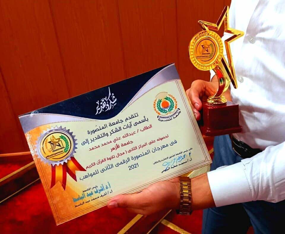 حصل علي المركز الثاني بجامعة المنصورة بالمهرجان الرقمي 2021، وحصل علي المركز الأول في حفظ القرآن الكريم بجامعة الأزهر بجميع فروعها في عام 2019، وحصل علي المركز الثاني ودرع جامعة القاهرة علي مستوي الجامعات في 2020.