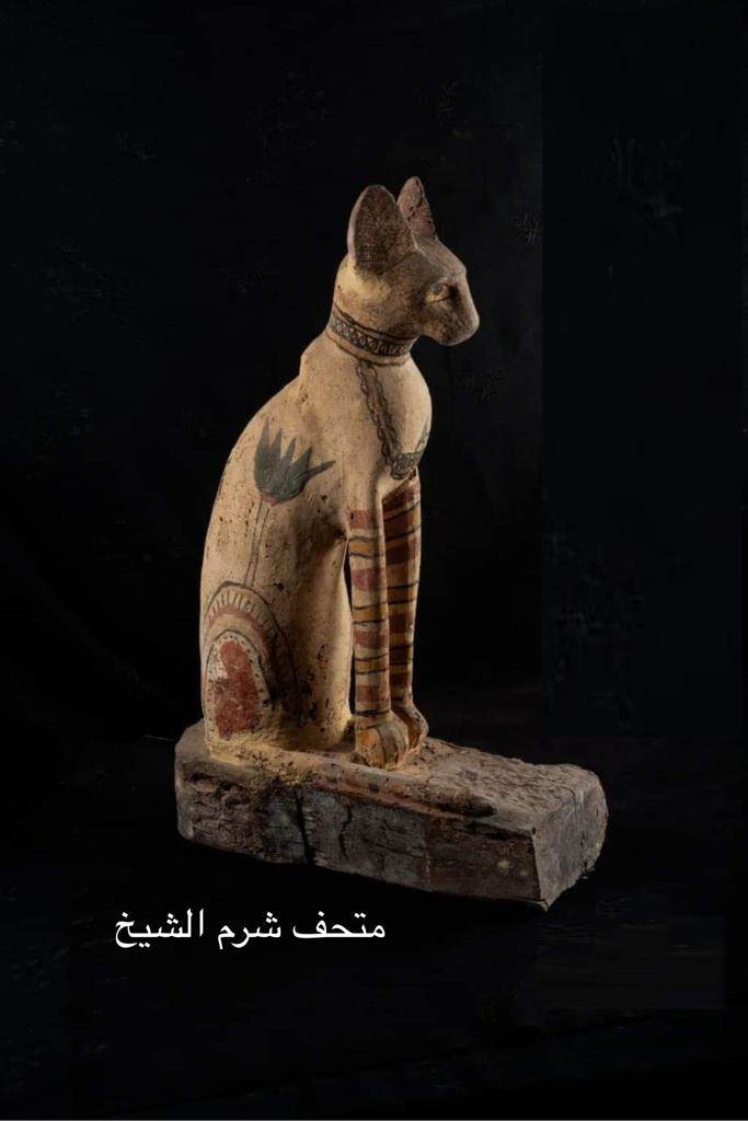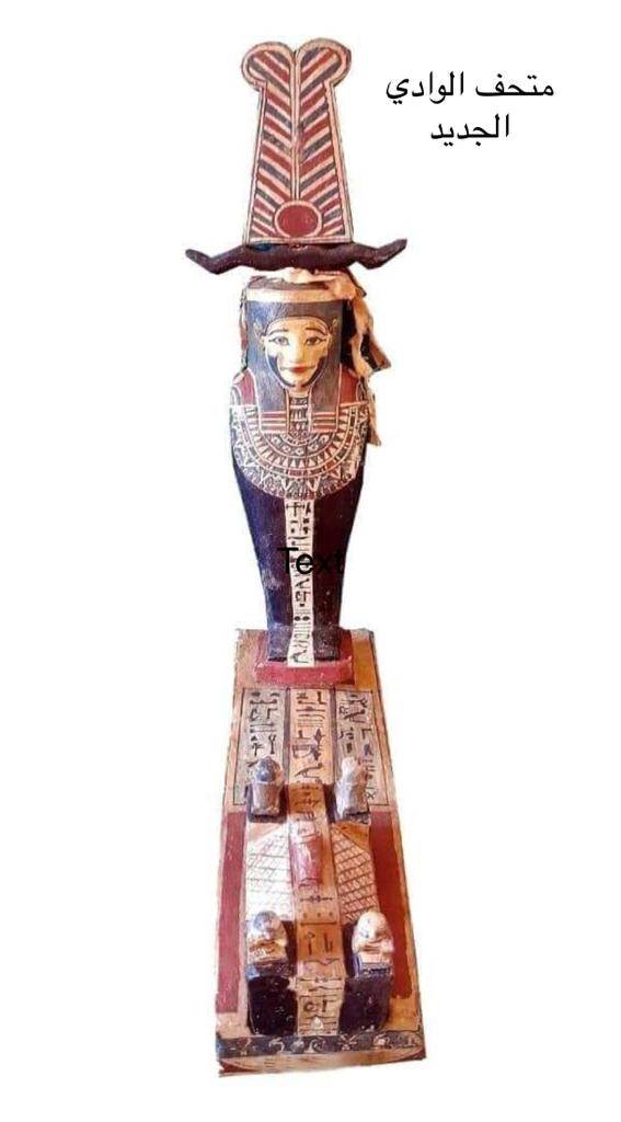 متحف آثار الوادي الجديد: يعرض تمثال مصنوع من الخشب، من العصر اليوناني الروماني يصور الإله اوزوريس يحمل فوق رأسه تاج عبارة عن ريشتين وقرني بقرة. متحف شرم الشيخ: يعرض تمثال من الخشب لقطة عليها زخارف بالمداد الأسود