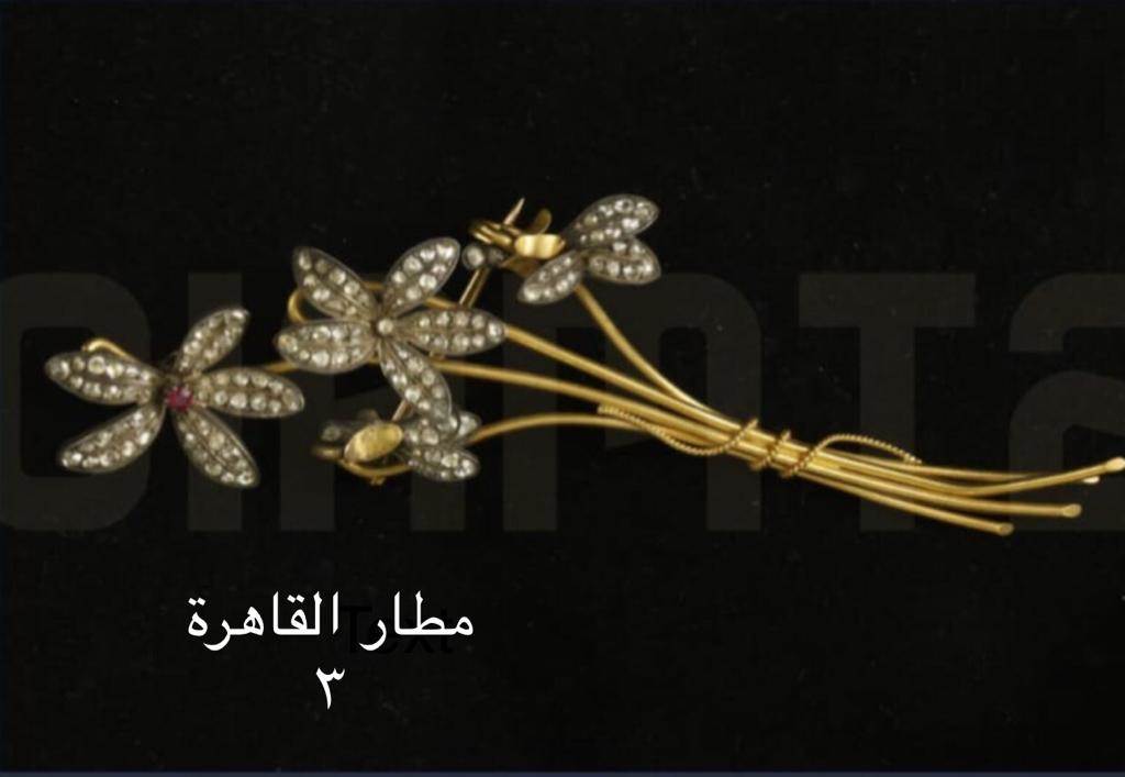 متحف مطار القاهرة الدولي ٢: يعرض دبوس صدر مصنوع من الذهب ومطعم بفصوص كريمة، يخص جانانيار هانم، والملكة فريدة.