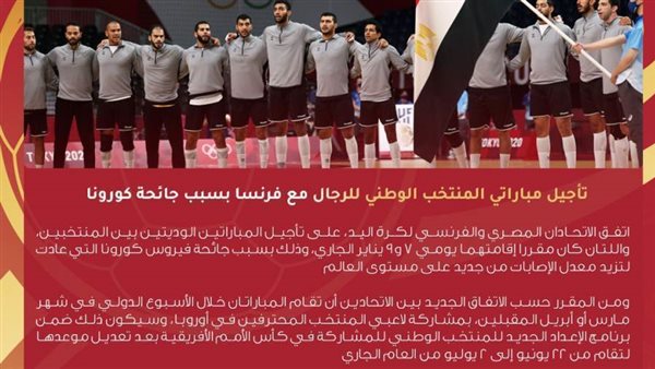 اتفق الاتحادان المصري والفرنسي لكرة اليد، على تأجيل المباراتين الوديتين بين المنتخبين، واللتين كان مقررا إقامتهما يومي 7 و9 يناير الجاري، وذلك بسبب جائحة فيروس كورونا، التي عادت لتزيد معدل الإصابات من جديد على مستوى العالم.