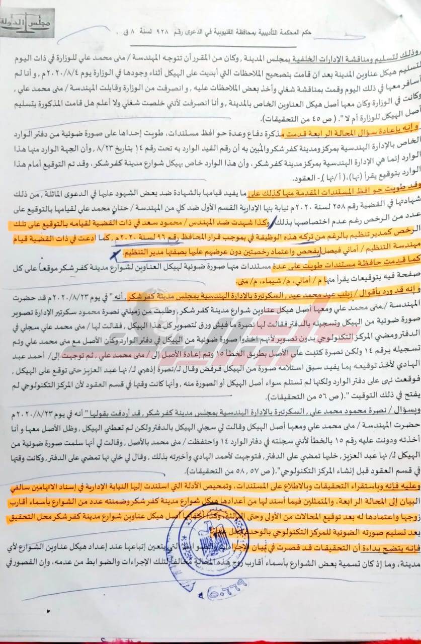 وقدمت المحالة الرابعة صورة ضوئية من الهيكل لعناوين شوارع مدينة كفرشكر إلى النيابة الإدارية والذي خلا من اى اسماء لاقارب زوجها أو أيا من أفراد عائلته ، وأشارت فى التحقيقات إلى توقيعها على كل ورقة من أوراق الهيكل الأساسي والمثبت فى دفتر الصادر والوارد والمقدم أيضا إلى المركز التكنولوجي مجلس مدينه كفر شكر.