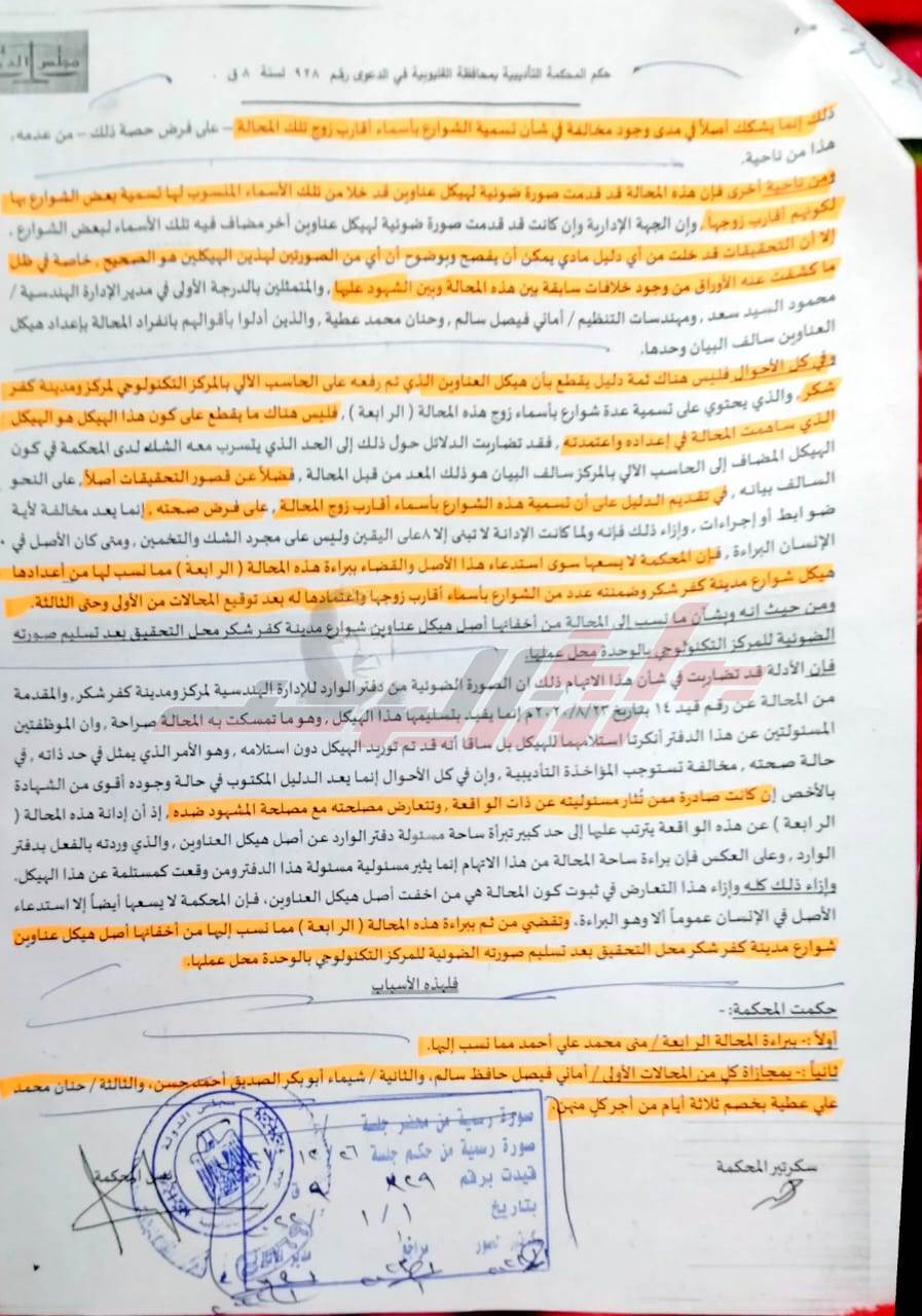 ببراءة المهندسة مني محمد على مديرة التنظيم بكفر شكر سابقا ممن نسب إليها فى القضية المعروفة إعلامياً « تسمية شوارع مدينة كفرشكر بأسماء أقارب مديرة التنظيم بكفرشكر»، ومجازاه كلا من المهندسة " امانى. ف"، و "شيماء. ا" و "حنان .م" بخصم ثلاث أيام من الراتب الشهري لكل منهم.