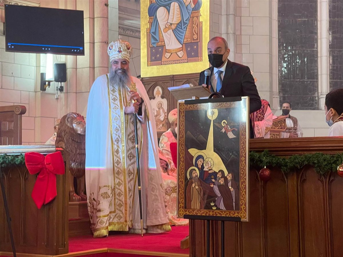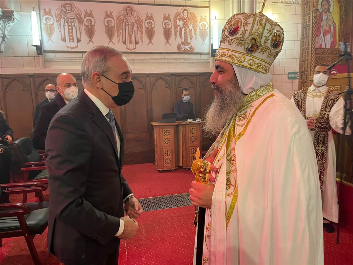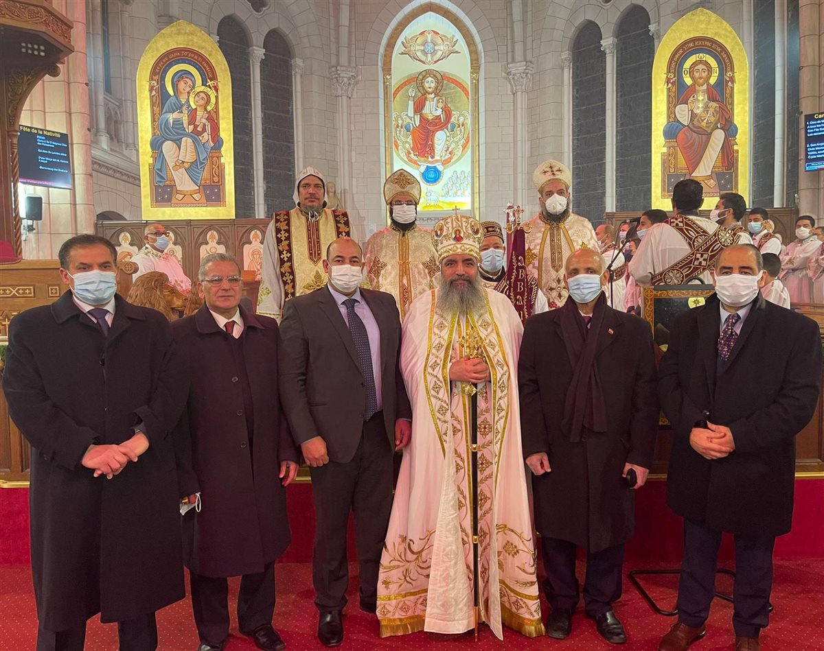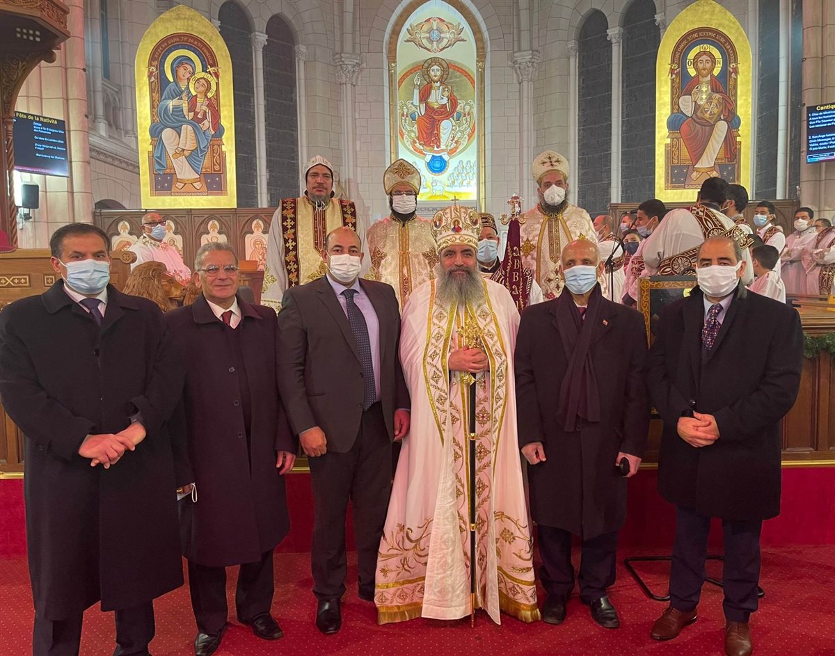 شارك الاتحاد العام للجالية المصرية بفرنسا في الاحتفال بعيد الميلاد المجيد في مقر الابراشية في درافيل وفي الكنيسة القبطية الأرثوذكسية بشاتني مالبري، وجاء في نص تقديم التهنئة إلى الحبر الجليل الأنبا مارك اسقف كنائس باريس وشمال فرنسا وإلى الاب الجليل الدكتور جرجس لوقا راعي الكنيسة القبطية الأرثوذكسية بشاتني مالبري وإلى الآباء الاجلاء وشعب الكنيسة الأشقاء الأحباب بكل الفخر والاعتزاز والفرح والسعادة، يسرنا المشاركة في هذه المناسبة العظيمة الاحتفال بعيد الميلاد المجيد لسيدنا عيسى المسيح- عليه الصلاة والسلام- الذي كان يوم ميلاده رسالة ربانية للمحبة والسلام للبشرية جمعاء، ولقد حظينا- نحن الشعب المصري- برحلة العائلة المقدسة ودعاء سيدنا المسيح (مبارك شعبي مصر)، ولقد حلت البركة على مصر، ومن أجل ذلك مصر محفوظة ومصانة، ويسجل التاريخ دوما بحروف من نور المواقف الوطنية للكنيسة المصرية وشعب الكنيسة الأشقاء الاحباب في الحفاظ على الوطن والعيش المشترك.. وتحيا مصر بشرفاء الوطن ووحدة الهلال مع الصليب، النسيج الوطني الواحد تحت القيادة الحكيمة للسيد الرئيس عبد الفتاح السيسي القائد البطل منقذ الوطن والمحافظ على البلاد والعباد، حفظ الله مصر شعبا وحكومة وقيادة، وكل عام وأنتم بخير وصحة وسلامة، ومصر في أمن واستقرار وتقدم وازدهار.