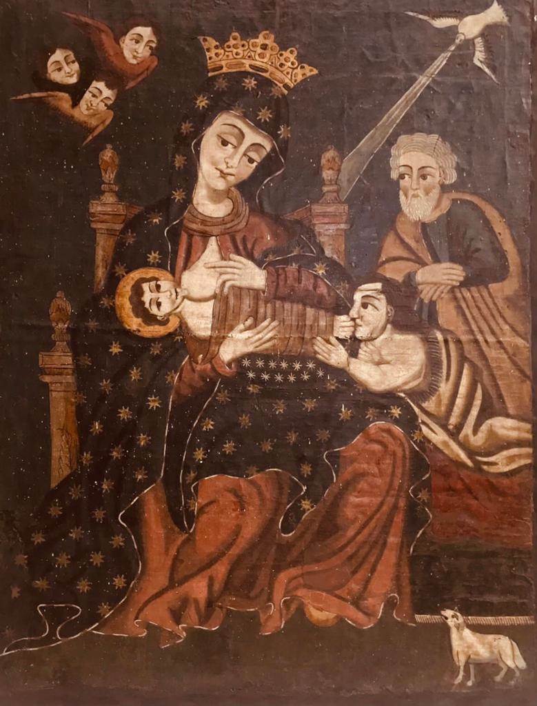 وفي خلفية الأيقونة تظهر امرأة أخرى، بالإضافة إلى عنصر معماري. وأيقونة السيدة مريم العذراء تُرضع طفلها يسوع ويحيطها ثلاث ملائكة إلى يمينها وحمامة إلى يسارها.