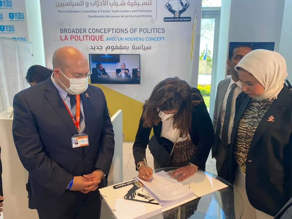 على هامش فعاليات النسخة الرابعة من منتدى شباب العالم المنعقد بشرم الشيخ في الفترة من ١٠ إلى ١٣ يناير، استقبل الجناح المخصص لتنسيقية شباب الأحزاب والسياسيين، اليوم الأربعاء، عددًا من الوزراء والشخصيات العامة، هم الدكتورة هالة السعيد، وزيرة التخطيط والتنمية الاقتصادية، والدكتورة رانيا المشاط، وزيرة التعاون الدولى، والدكتورة نبيلة مكرم، وزيرة الهجرة، وكابتن طيار محمد منار، وزير الطيران المدني، والدكتورة إيناس عبد الدايم، وزيرة الثقافة، والكاتب الصحفى عبد المحسن سلامة، رئيس مجلس إدارة مؤسسة الأهرام ونقيب الصحفيين السابق، والكاتب الصحفى عماد الدين حسين، رئيس تحرير جريدة الشروق وعضو مجلس الشيوخ، والمطران نيقولاوس هنري سفير الفاتيكان بالقاهرة.