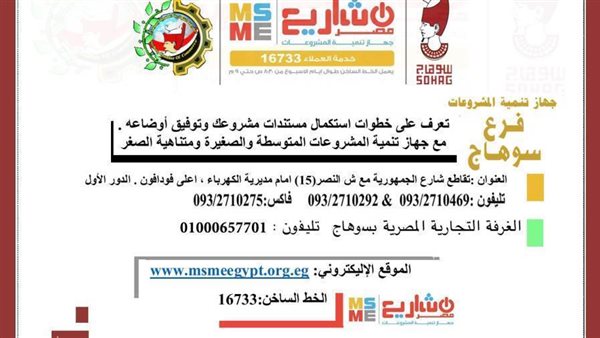 للاستفسار عن إجراءات التراخيص وكيفية تقديم الطلبات يرجى الاتصال على رقم 16733 الخط الساخن لجهاز تنمية المشروعات، وأرقام فرع جهاز تنمية المشروعات الصغيرة والمتوسطة والمتناهية الصغر بسوهاج على 2710292/093 ـ 2710469/093ـ فاكس رقم 2710275/093، والغرفة التجارية بسوهاج على رقم 01000657701.