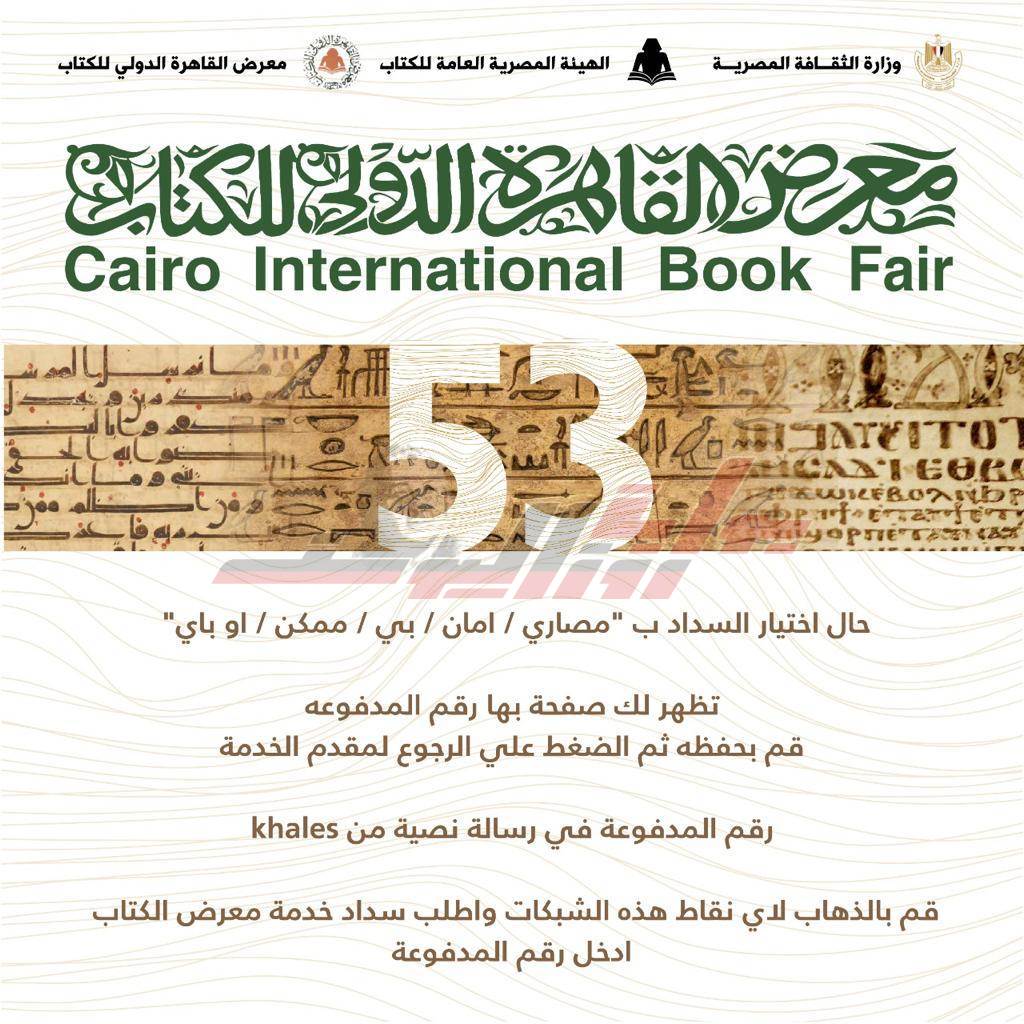 سيصلك رقم المدفوعة في رسالة نصية من khales قم بالذهاب لأي نقاط هذه الشبكات واطلب سداد خدمة معرض الكتاب، ادخل رقم المدفوعة، عند إتمام السداد تصلك رسالة نصية برابط تذكرتك لمعرض الكتاب علي رقم الهاتف الذي قمت بتسجيله عند التسجيل.