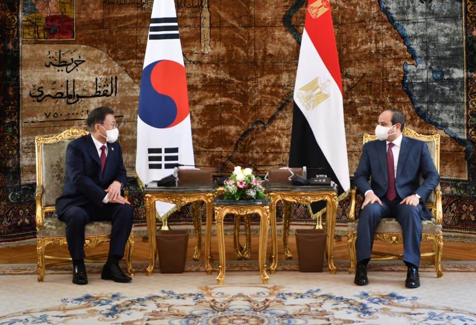 وصرح المتحدث الرسمي باسم رئاسة الجمهورية، بأن الرئيسين عقدا جلسة مباحثات ثنائية، أعقبها جلسة موسعة ضمت وفدي البلدين، حيث رحب الرئيس بنظيره الكوري الجنوبي، وذلك في أول زيارة لرئيس كوري جنوبي إلى مصر منذ حوالي 16 عاماً، مشيداً سيادته بعمق العلاقات بين البلدين الصديقين، وبالزخم الملحوظ الذي تشهده خلال الفترة الماضية، ومؤكداً أهمية العمل على تفعيل الشراكة التعاونية الشاملة بين الجانبين، بما يتناسب مع إمكانات ومقدرات مصر وكوريا الجنوبية، ويساعد مصر على الاستفادة من التجربة التنموية الفريدة لكوريا الجنوبية.
