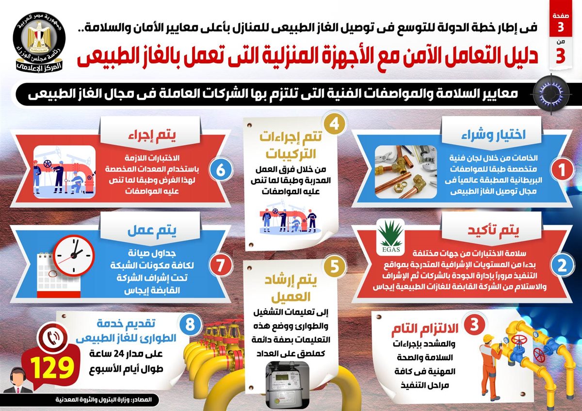 أكد المركز الإعلامي لمجلس الوزراء أنه فى الوقت الذي تسعى فيه الدولة إلى التوسع في خطط توصيل الغاز الطبيعي إلى المنازل، فإنها تحرص أيضا على اتباع وتطبيق كافة معايير الأمان والسلامة حفاظاً على حياة المواطنين، وهو ما يبرز أهمية خلق حالة من الوعي داخل المجتمع المصري بكيفية التعامل مع الأجهزة المنزلية التي تعمل بالغاز الطبيعي.