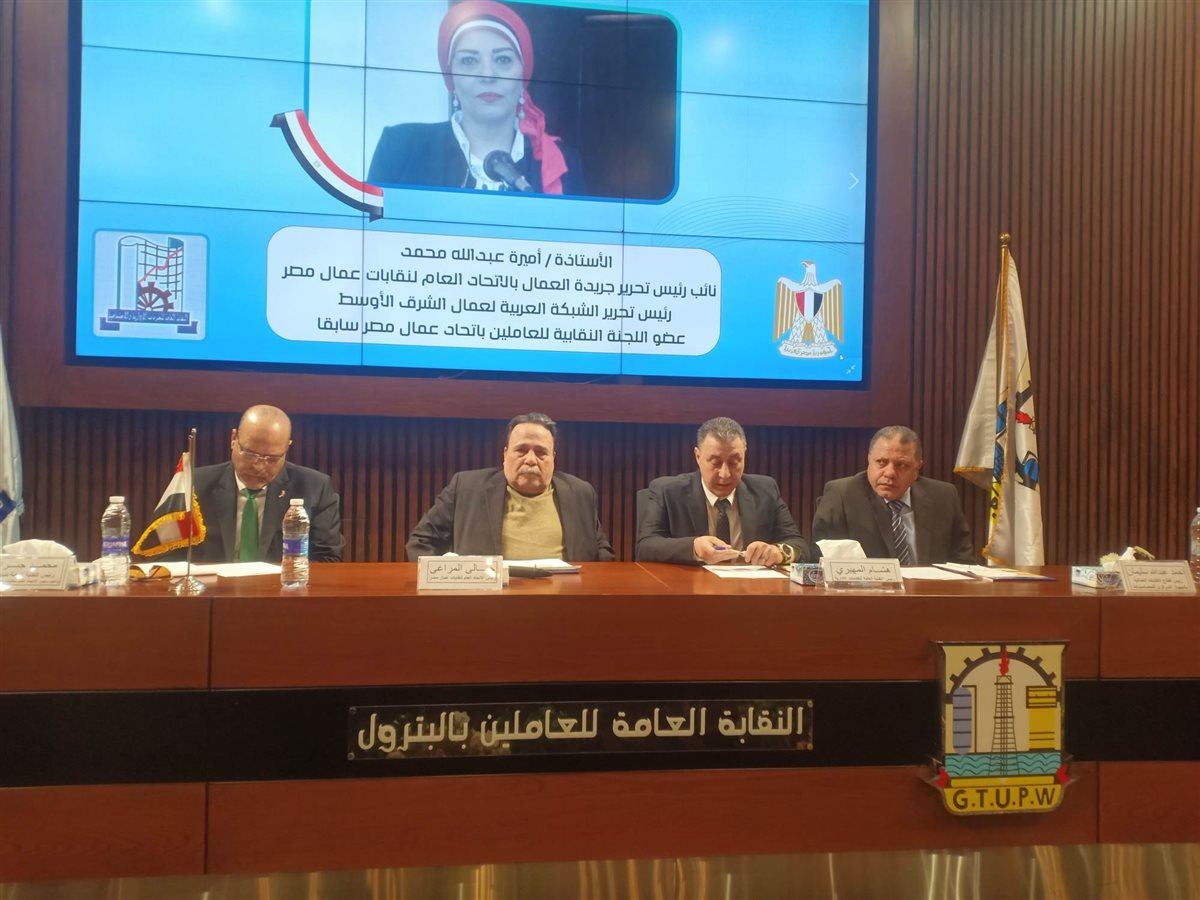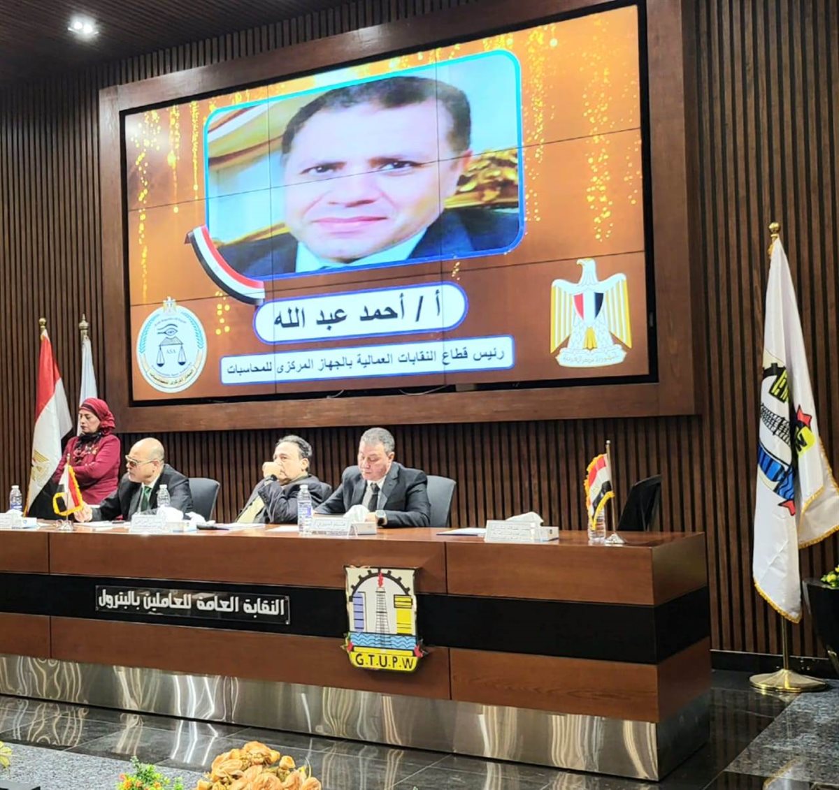 جاء ذلك خلال مؤتمر الجمعية العمومية العادية لنقابة الخدمات الادارية والاجتماعية برئاسة هشام فاروق المهيرى وبحضور جبالى المراغى رئيس الاتحاد العام لنقابات عمال مصر واحمد عبد الله سليمان رئيس قطاع النقابات العمالية بالجهاز المركزى للمجاسبات ومنيرة الاشقر عضو مجلس النواب وعبد الفتاح ابراهيم رئيس نقابة الغزل والنسيج وعبد المنعم الجمل رئيس نقابة البناء والأخشاب وعلى عبد الباسط رئيس نقابة الخدمات الصحية وعبد الفتاح فكرى رئيس نقابة السكة الحديد وابراهيم هيكل رئيس نقابة الاتصالات وعلي عبد الوهاب رئيس نقابة النيابات وسعيد النقيب رئيس نقابة الإنتاج الحربي ومحمد جبران رئيس نقابة البترول ونواب رئيس الاتحاد العام لنقابات عمال مصر وهشام جلال أمين صندوق نقابة الخدمات الادارية وحمدى عرابى نائب رئيس نقابة الخدمات الادارية وهشام عبد اللطيف الامين العام لنقابة الخدمات الاجتماعية وسحر محمود أمينة المرأة وقيادات النقابات العامة واللجان النقابية.