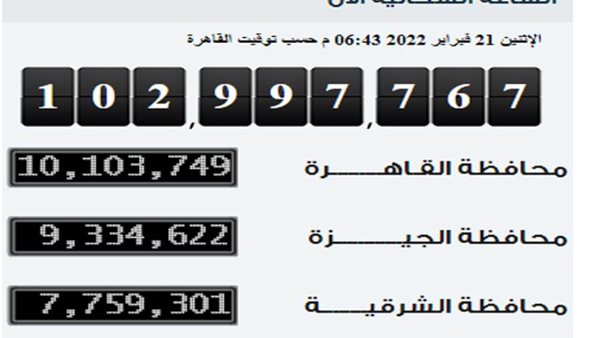 وكان عدد السكان قد بلغ 102 مليون نسمة يوم الاثنين 5 يوليو 2021، وفقاً لما أعلنته الساعة السكانية بالجهاز المركزي للتعبئة العامة والإحصاء المرتبطة بقاعدة بيانات تسجيل المواليد والوفيات بوزارة الصحة والسكان.