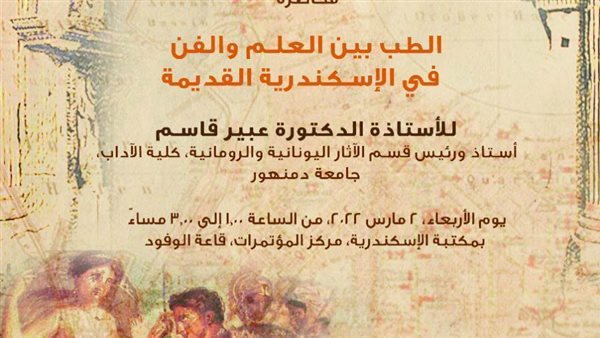 تنظم مكتبة الإسكندرية محاضرة بعنوان “الطب بين العلم والفن في الإسكندرية القديمة”، تلقيهاأ.د. عبير قاسم، أستاذ ورئيس قسم الآثار اليونانية والرومانية بكلية الآداب بجامعة دمنهور. وذلك يوم الأربعاء 2 مارس في تمام الساعة الواحدة ظهراً بقاعة الوفود بمركز المؤتمرات في مكتبة الإسكندرية.